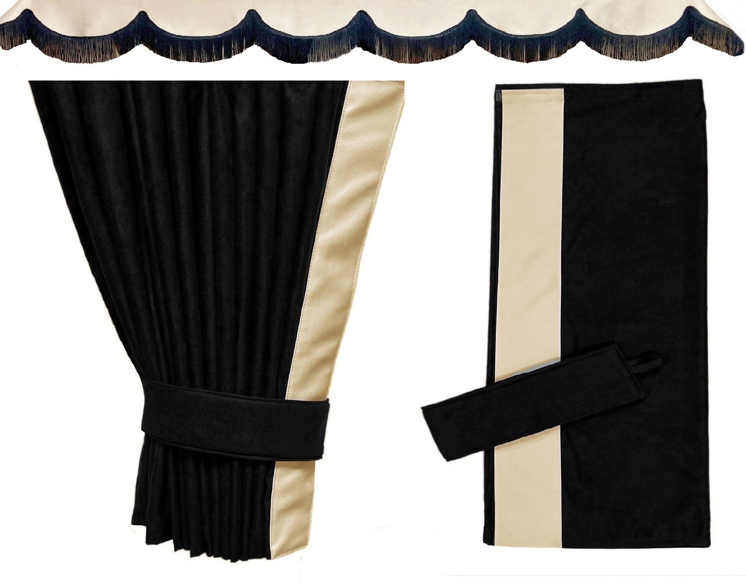 Кожна бічна штора оздоблена кромкою з екошкіри. Ширина краю 9 см. - дивіться фотографії
