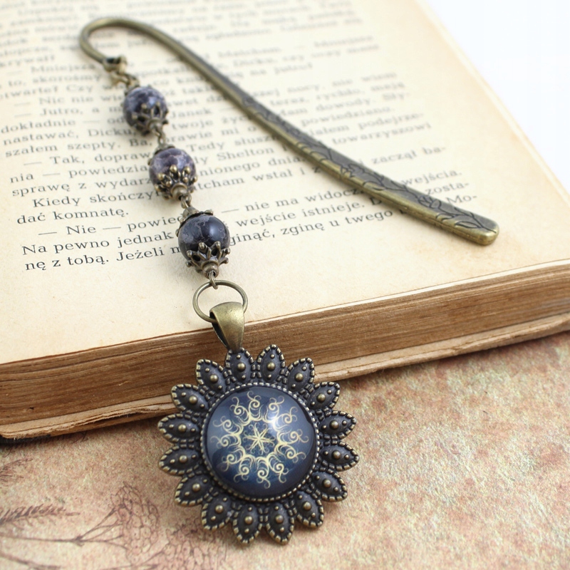 Закладка ручної роботи з натуральним камінням і підвіскою із зображенням мандали. Графіка укладена під опукле скло, обрамлене в основу з античної бронзи.