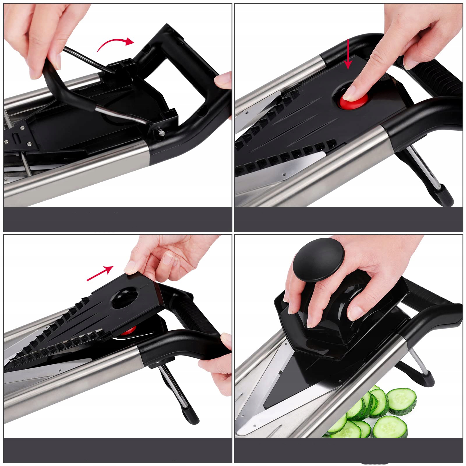 - Наркошник і овочевий подрібнювач простий у використанні - Просто відкрийте складні ніжки та натисніть червону кнопку, щоб замінити лезо. стабільність. Дуже міцні рукавички захищають пальці.