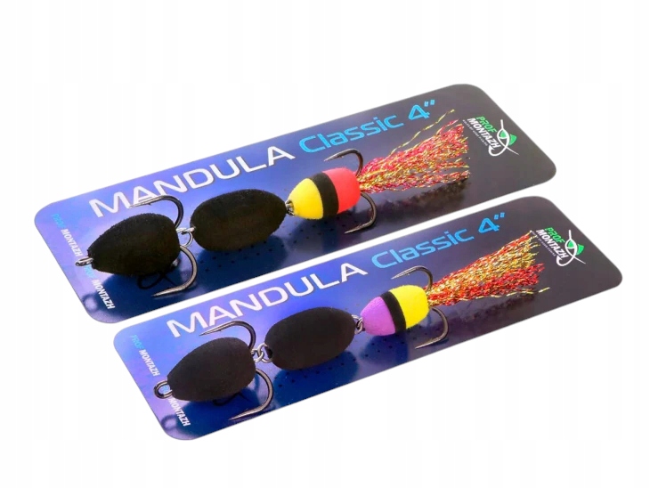 Mandula classic 3 segments 100mm - має найширшу колірну гамму - 152 контрастних, дво- і триколірних поєднання, що дозволить підібрати мандулу на будь-який смак і умови лову хижака. Складається з 3 обтічних сегментів. Сьогодні ця форма корпусу стала класичною і перевірена мільйонами рибалок по всьому світу. загальна довжина 10 см, це універсальний середній розмір, добре підходить для полювання на багатьох хижаків: судака, щуку, окуня, сома і навіть жереха. Оснащений двома гострими трійниками розмірів 2 і 4. Оздоблення хвоста виконано з високоякісного двоколірного люрексу, який додатково розпушується вручну на етапі виготовлення мандули. Приманка добре працює як в стоячій, так і в проточній воді. Абсолютно невибаглива до типу навантаження (розкладна Чебурашка, Джиг-Ріг, Данс-Ріг та інші). Завдяки обтічній формі корпусу дозволяє ловити на великих дистанціях, де в більшості випадків риба не така полохлива і не піддається нападам хижаків. під тиском інших рибалок.