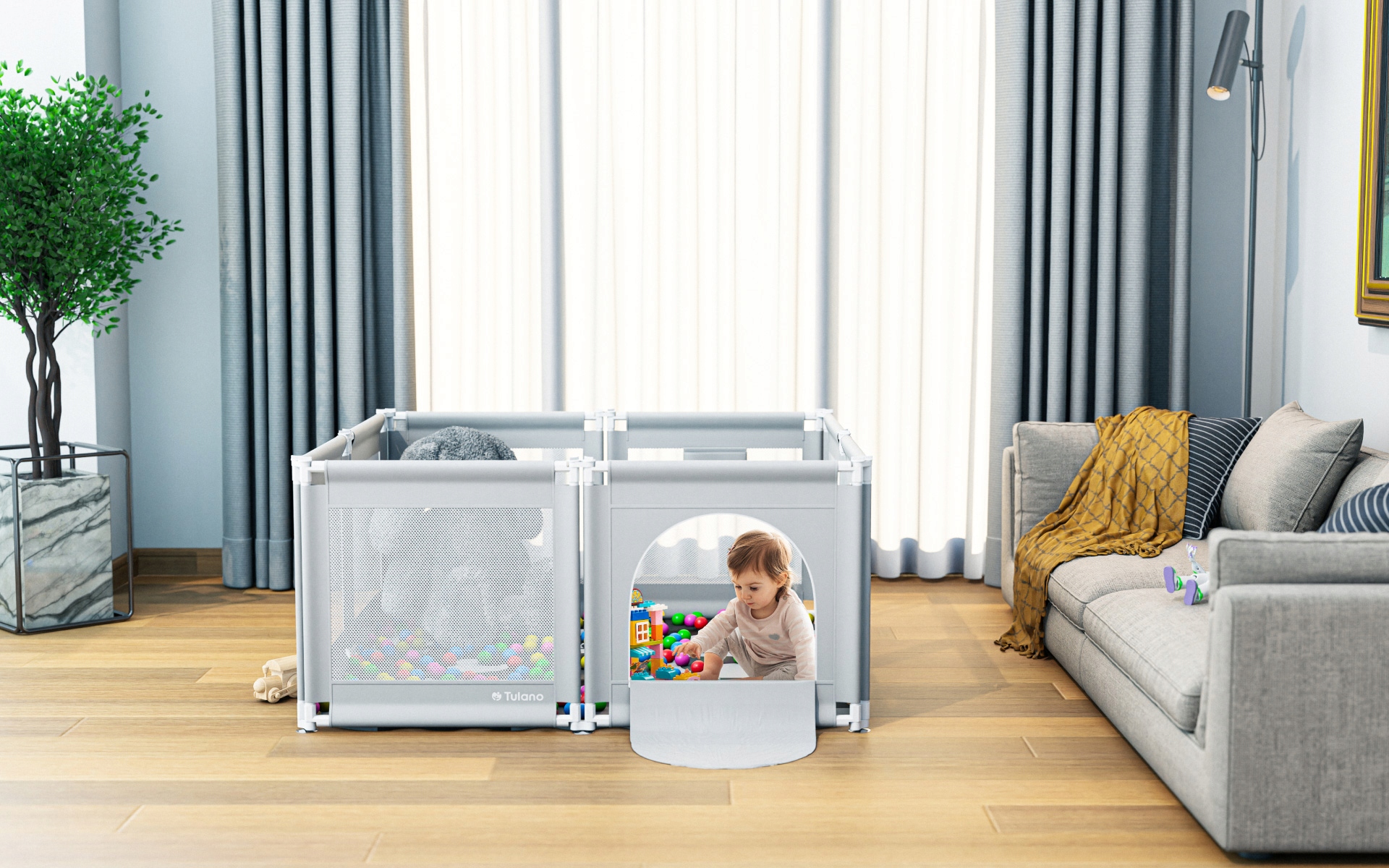 Манеж можна розмістити на килимі, панелях або плитці всередині будинку, але він так само добре працює на терасі або траві. Мінімалістичний сіро-білий дизайн ідеально вписується в більшість композицій.