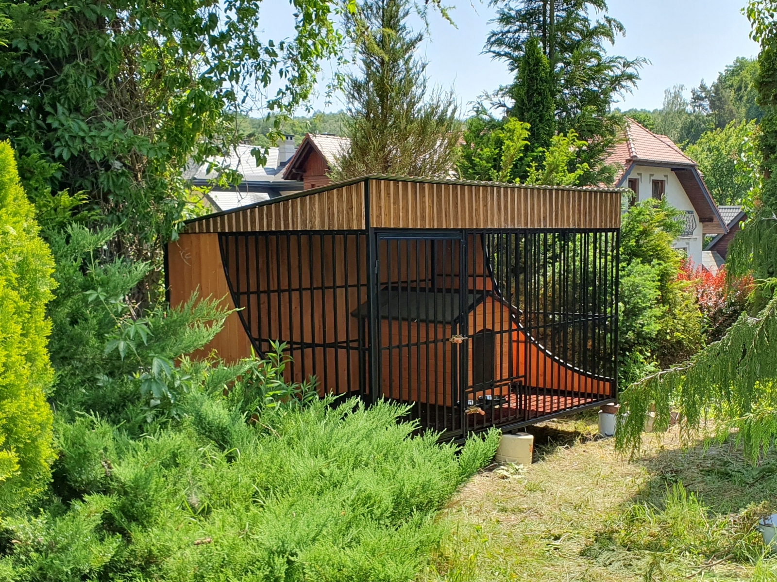 Конструкція була покрита порошковою фарбою методом печі. Поверхня лаку стійка до ультрафіолетового випромінювання, тому колір не тьмяніє і залишається інтенсивним, незважаючи на час. Манеж накритий, тому собака може перебувати там незалежно від погодних умов. Дах манежу в базовому варіанті має нахил до спинки.