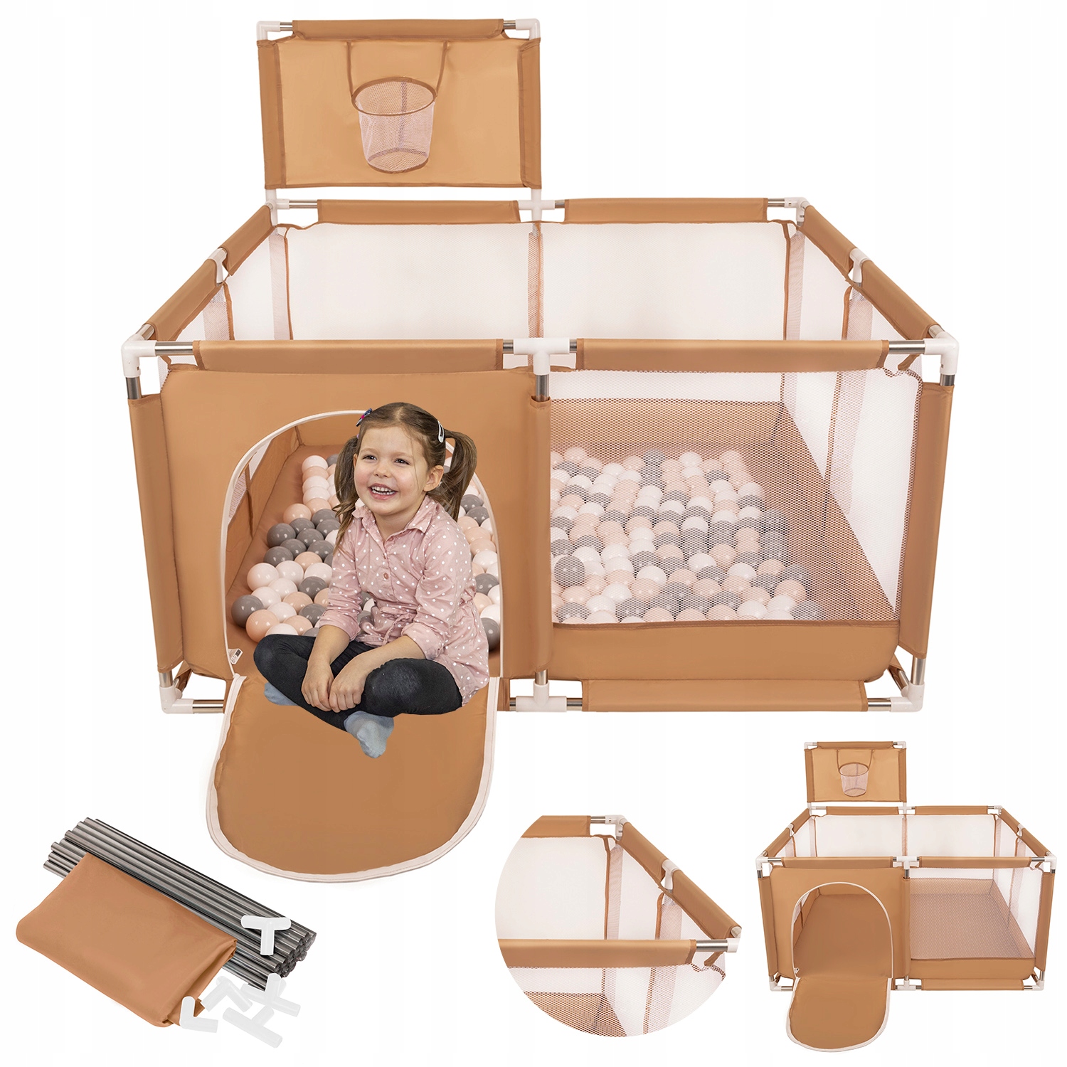 - бічні стінки з сітки дозволяють вам щоб спостерігати за дітьми під час гри, щільна тканина міцна та не розтирається