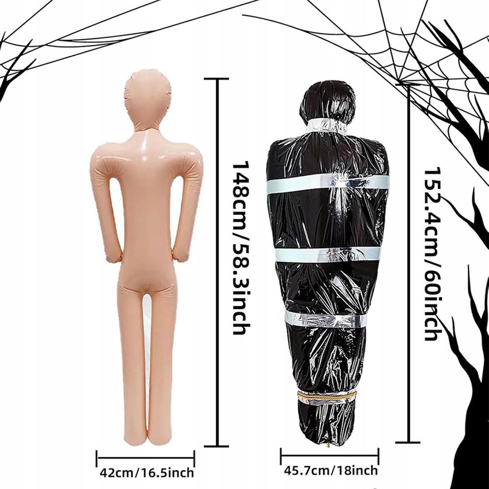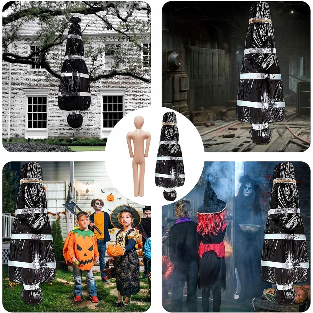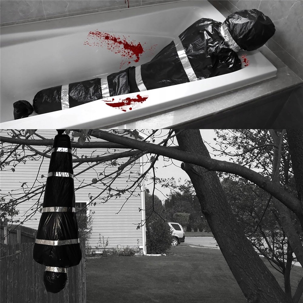 Просто помістіть надувний труп у чорний поліетиленовий пакет і закріпіть його ниткою та липкою стрічкою. Його можна легко повісити в різних місцях, забезпечуючи зручність і швидкість встановлення.