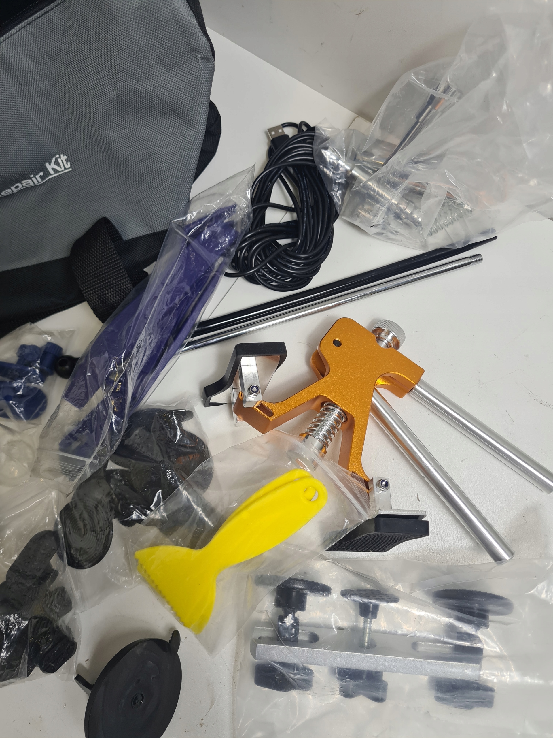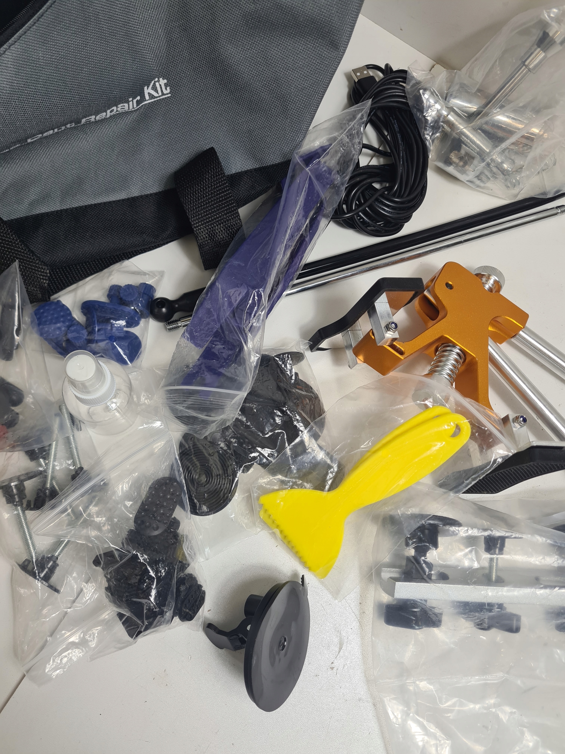 Продукт використовується з відсутністю. вм'ятини , що ідеально підходить для спалахів у транспортних засобах, без фарбування. Набір включає ковзаючий молот , металевий міст та інструмент з регульованою шириною , що дозволяє точне та ефективне зняття вмістів без пошкодження лаку.