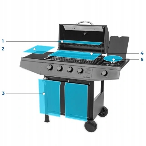 Газовий гриль складається з чотирьох пальників та додаткового бічного пальника, , що дозволяє одночасно гриль різних страв. Гриль оснащений системою електро живлення, що полегшує використання та стрілянину пальників. Конструкція виготовлена з міцних матеріалів, що забезпечує ефективність пристрою. Гриль має чавунну решітку , що дозволяє багато років використовувати гриль. ✔ Термометр ✔ Додатковий бічний пальник зберігайте шафу для зберігання жирних контейнерів з дверима