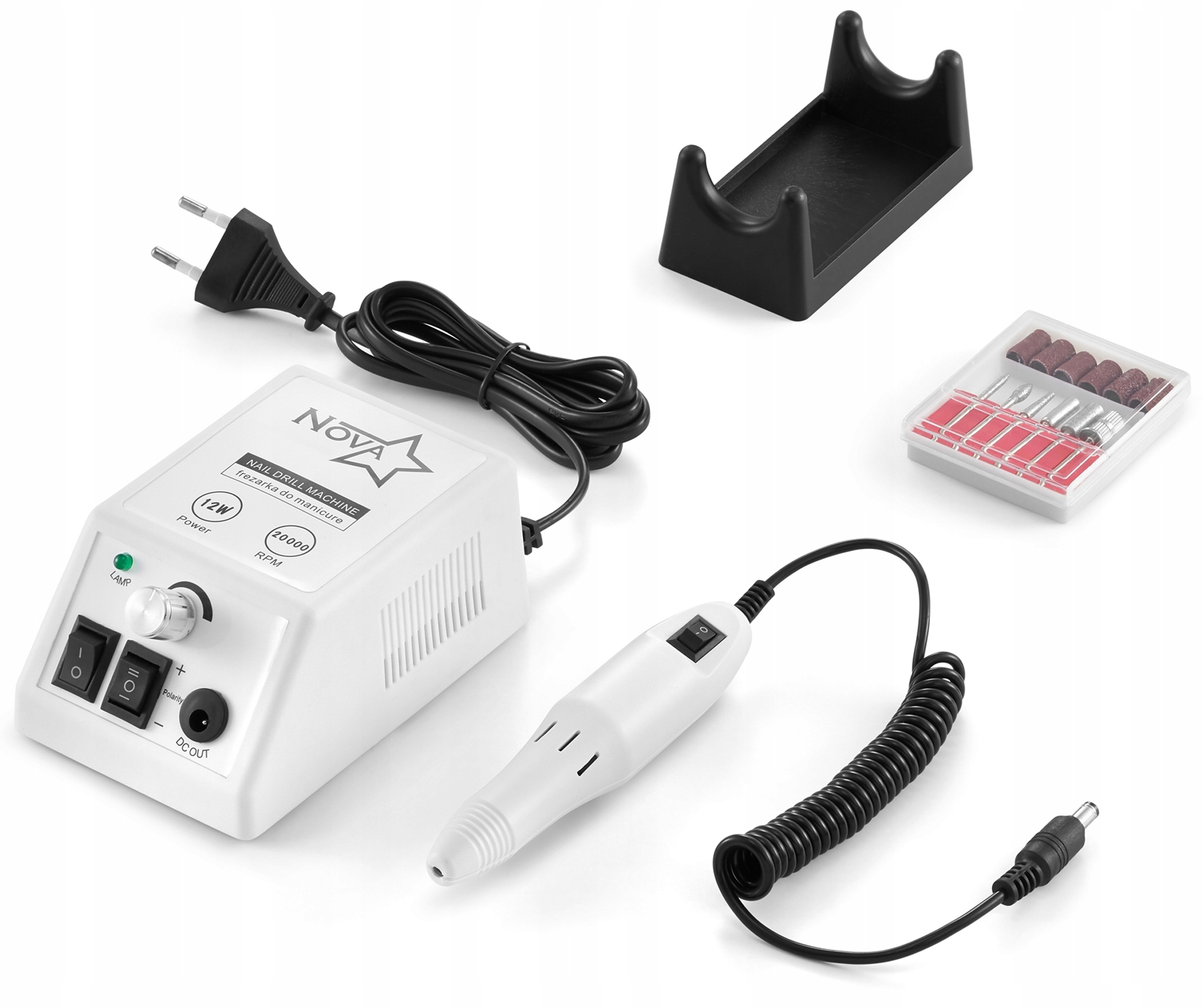 фрезерний машина для манікюру та педикюру, при регулюванні швидкості до 20 000 обрухів на хвилину. За допомогою цього пристрою ви вирівнюєте та відпускаєте нігті, видаліть залишки наконечників або нігтів. Містить:
