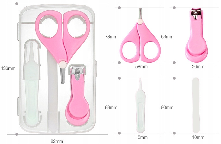 Завдяки спеціально розробленим ножиці та тегах безпечно Ви вирізаєте нігті до своєї дитини. естетика випадок дозволить гігієнічні та комфортне зберігання набору. Це Маленький Завдяки якому ви покладете його в шафу ванної кімнати, або упакуйте в сумку під час подорожі.