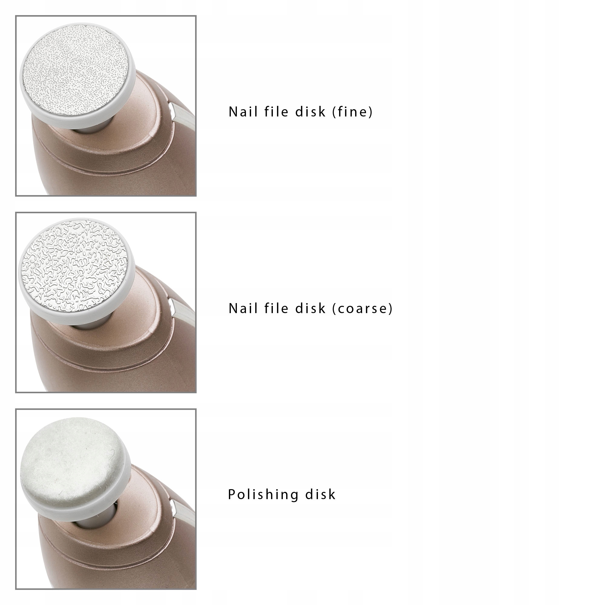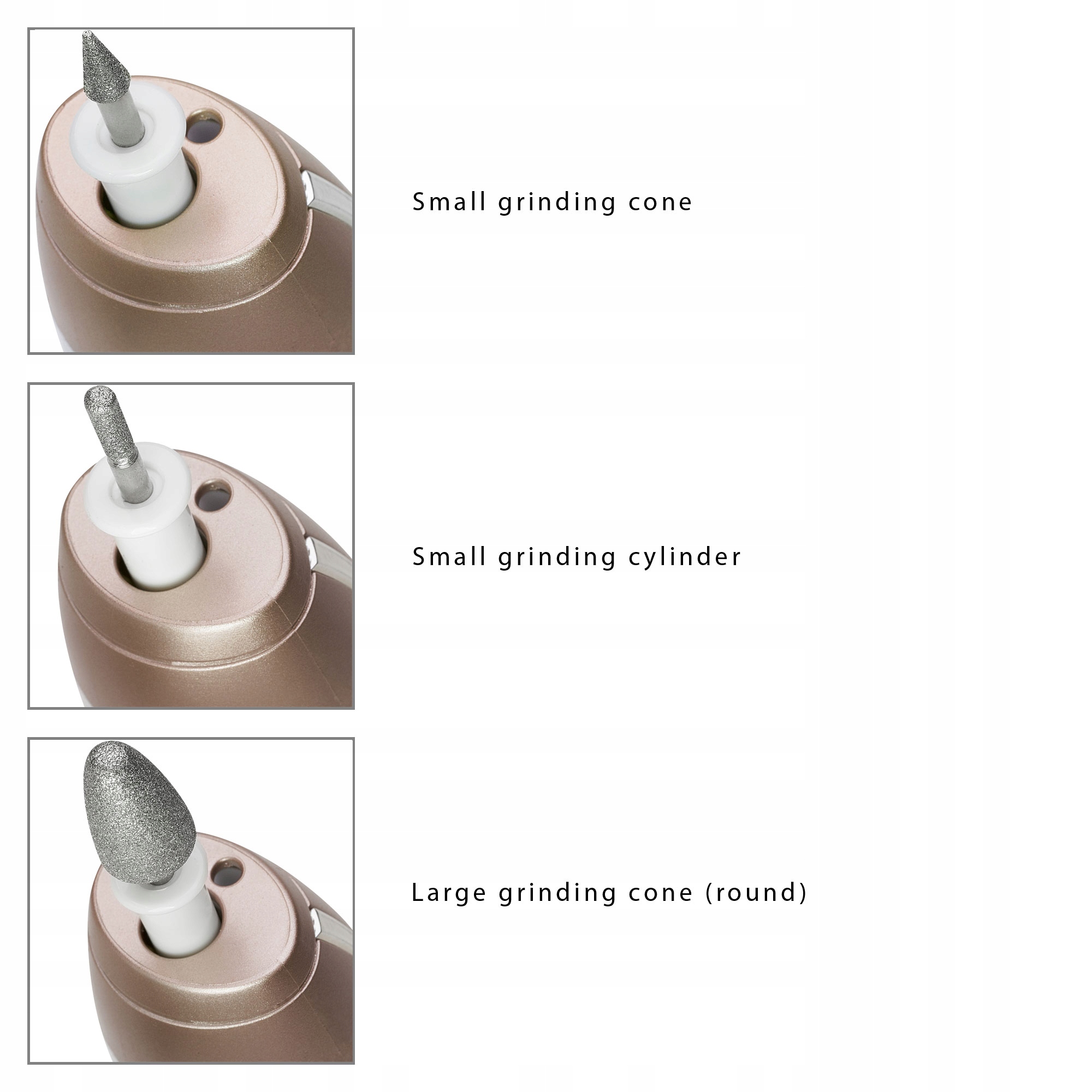 - 6 різних насадок: 1 насадка для полірування, 2 напилки (груба/тонка), 1 великий пиляльний конус (м’який наконечник), 1 маленький напильний конус (загострений наконечник), 1 малий шліфувальний валик