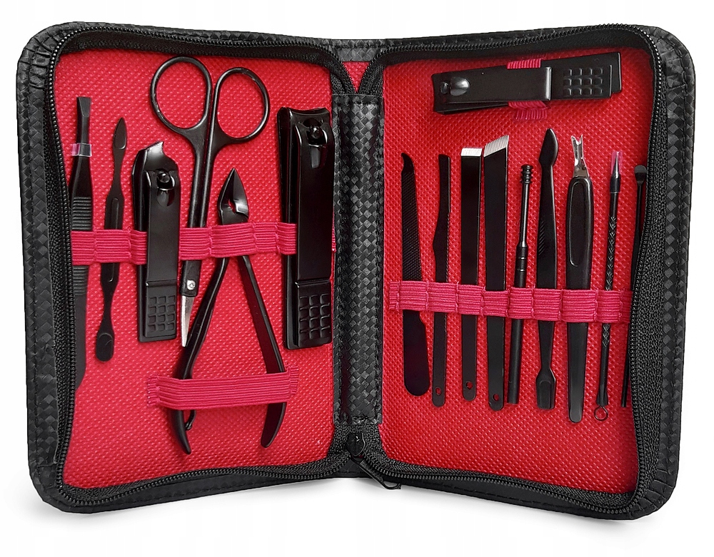 Надзвичайно практичний набір для педикюру, манікюру та інших процедур для нігтів. Оснащений 16 елементами, такими як манікюрні ножиці, кусачки, кусачки для нігтів, шпатель, наконечник, пінцет.