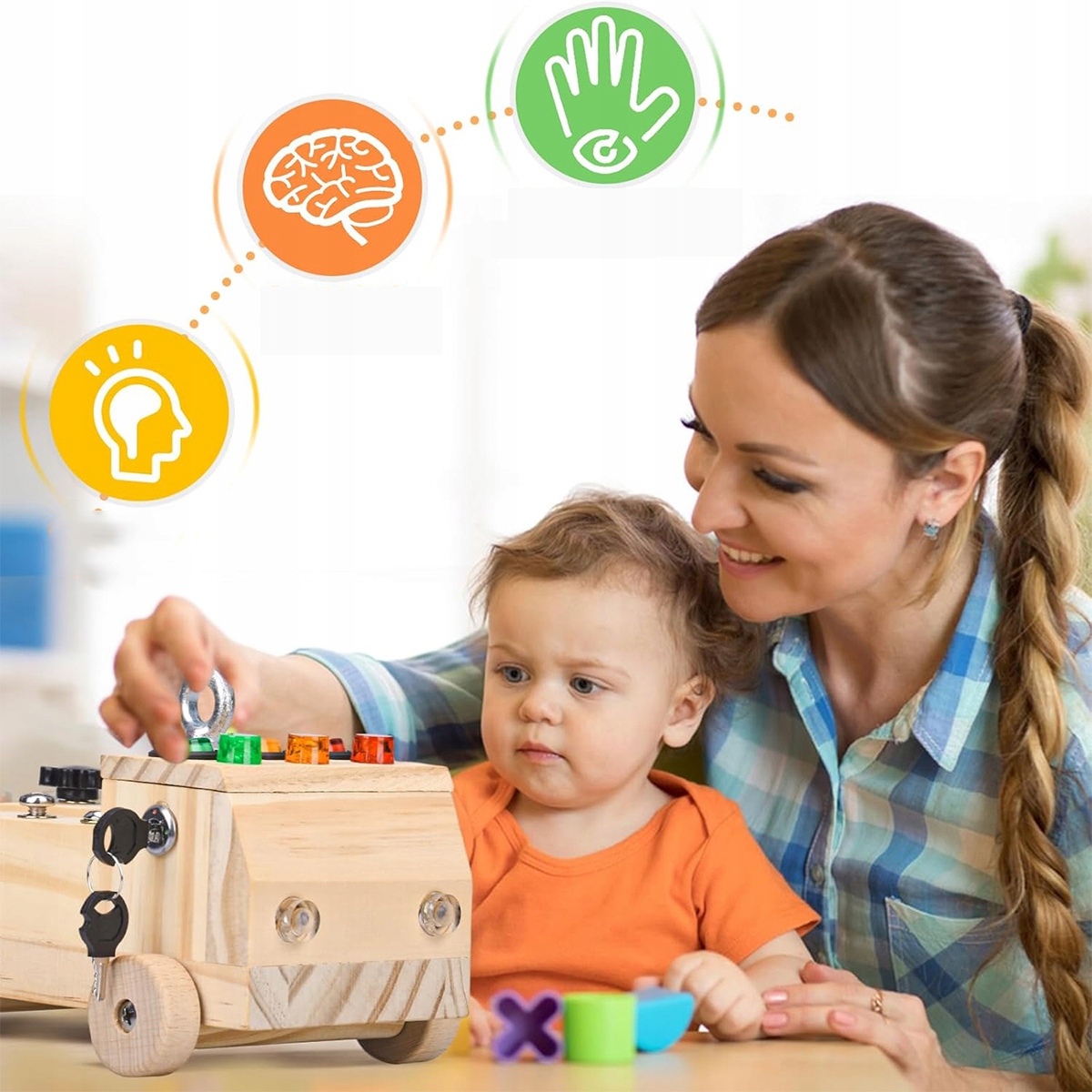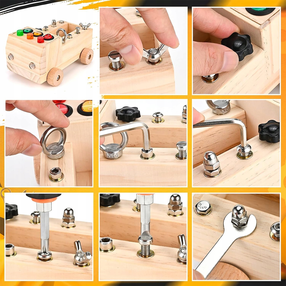 Дерев’яні сенсорні іграшки постачаються з різноманітними гвинтами та гайками, а також відповідними викрутками та гайковими ключами, щоб діти могли навчитися відкручувати кожен гвинт за допомогою відповідних інструментів і розвивати координацію рук і очей, логічне мислення, сенсорний досвід, точні рухи та навички вирішення проблем.