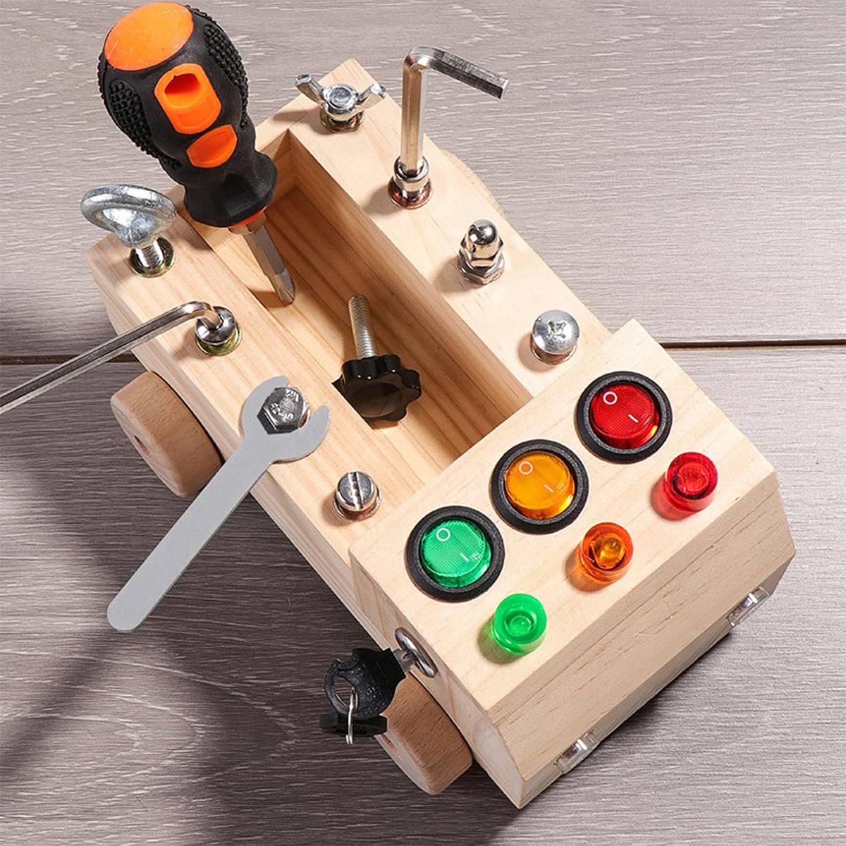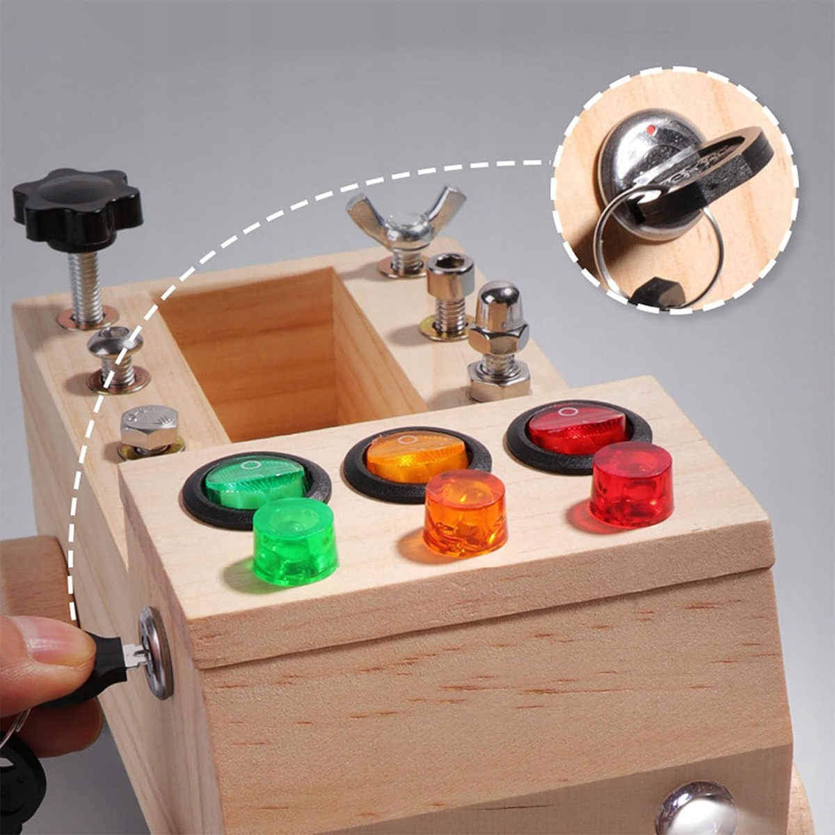 Дерев’яна дошка Монтессорі з гвинтами розроблена спеціально для дітей, яким подобаються вимикачі та світлодіоди. Він містить ручки, які відповідають перемикачам, і повний набір аксесуарів, які розвивають у дітей ручні та практичні навички, дозволяючи їм навчатися самостійно та долати труднощі.