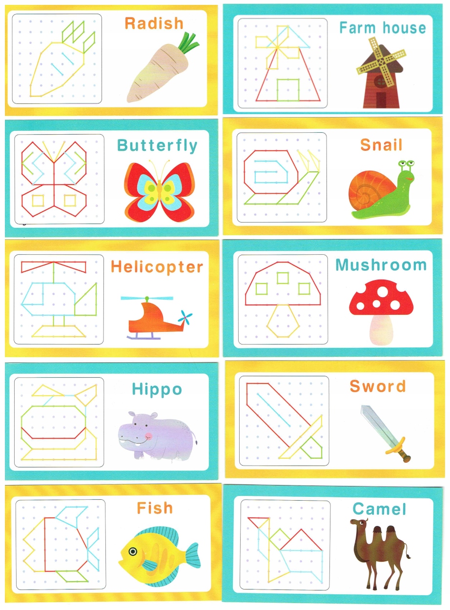 ✅ Щоб почати грати, розкладіть гумки на дошці будь-яким візерунком. Ви можете розміщувати прості візерунки, такі як квадрати, прямокутники, кола, а також більш складні, такі як тварини, будівлі чи казкові герої.