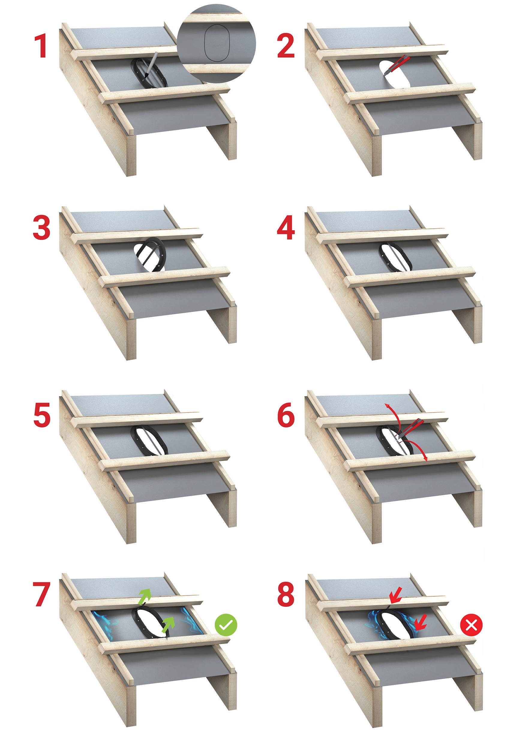 Хомутка з двох частин забезпечує ефективну герметизацію місця проходження камінної труби через мембрану даху. Його завдання - відводити дощову воду від отвору в фользі, захищаючи теплоізоляцію від вологи.