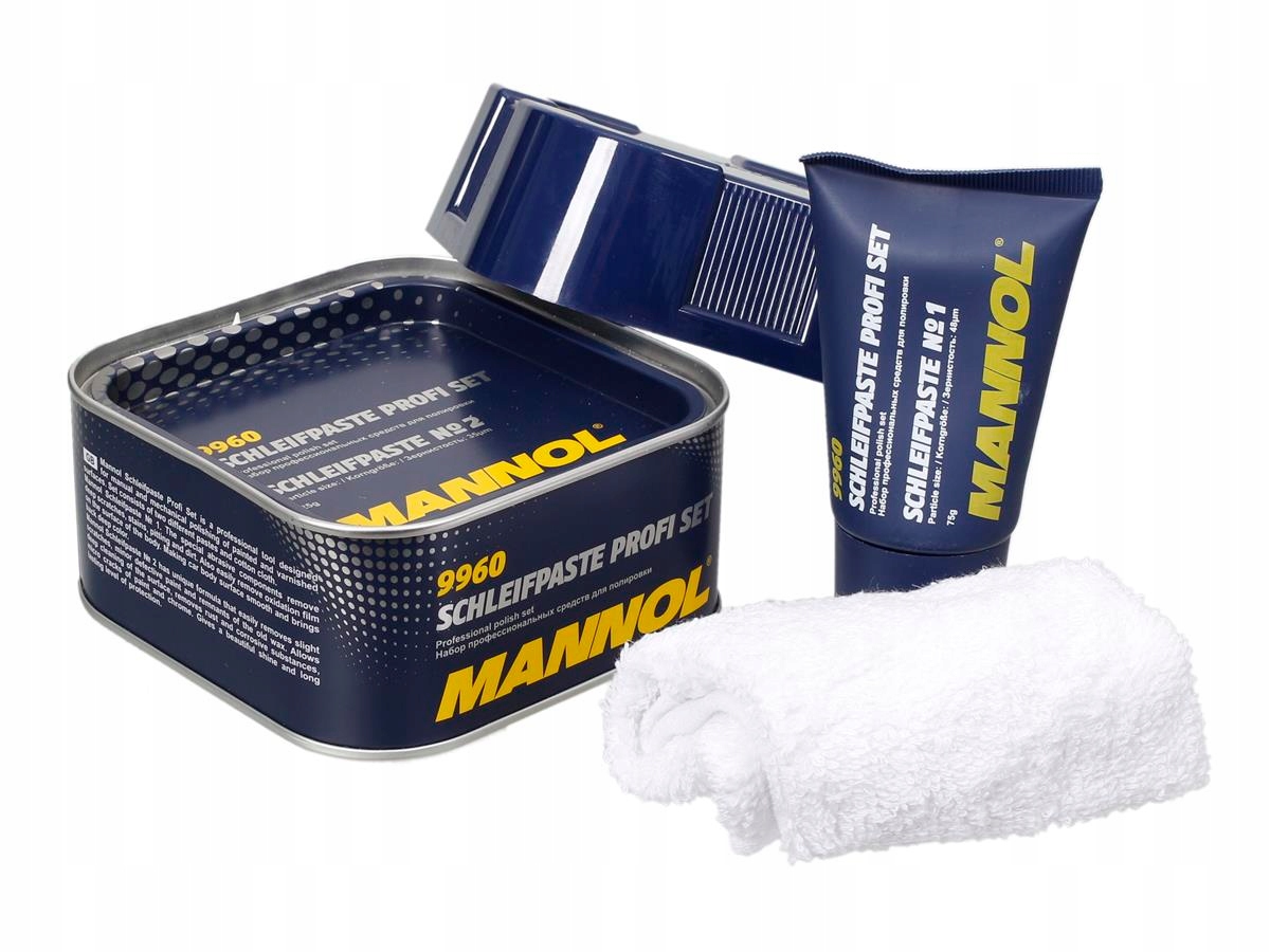 MANNOL Schleifpaste Profi Set - набір професійних засобів для ручного та механічного очищення лакованих та пофарбованих поверхонь. Пасти розрізняються залежно від розміру фрикційних речовин. Шлейфпаста MANNOL № 1 видаляє глибокі подряпини, корозію та подряпини фарби завдяки абразивним компонентам. Видаляє обвітрені та тьмяні шари фарби. Шлейфпаста MANNOL № 2 видаляє неглибокі подряпини, дрібні дефекти на лакованих і фарбованих покриттях, повертає блиск. Легко видаляє залишки після фарбування кузова, дозволяє глибоко фарбувати поверхню, видаляє іржу та корозійні речовини з мікрощілин фарби та хромованих елементів.