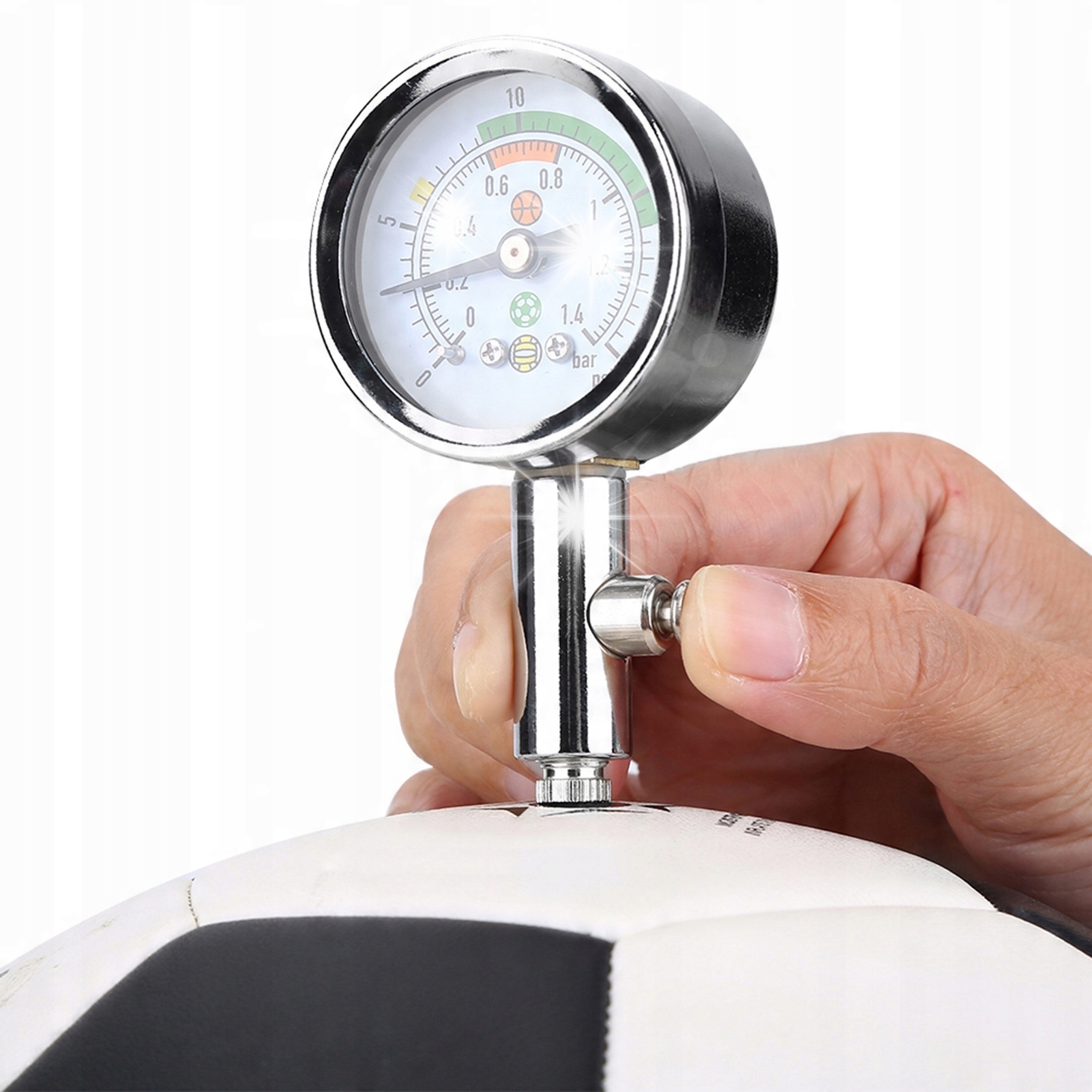 Діапазон вимірювання: 0-1,4 бар / 0-20 psi Підходить для: різних спортивних м’ячів, таких як баскетбол, футбол, волейбол тощо.