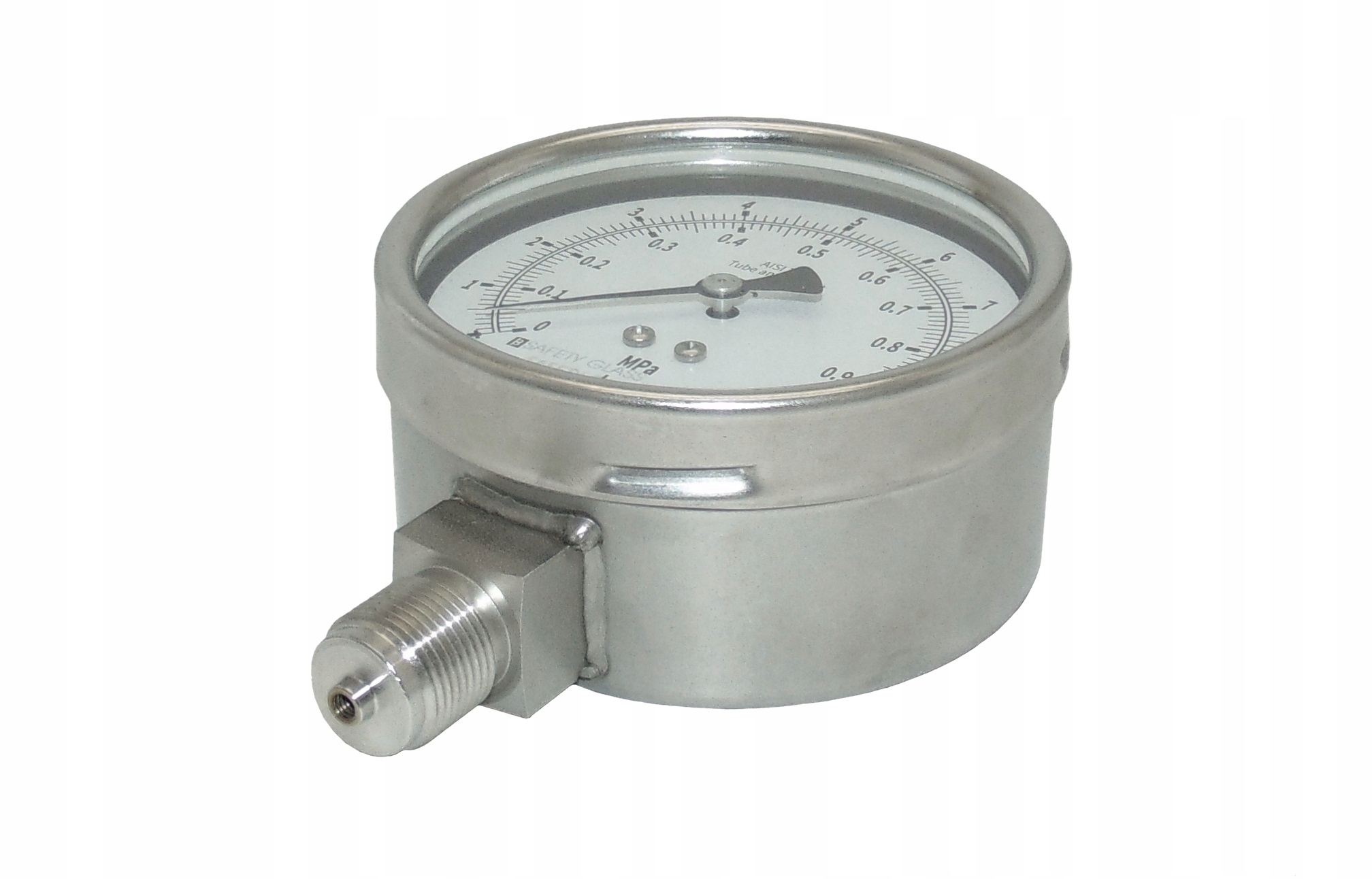 Манометр промисловий МС-100К - призначений для вимірювання тиску рідин і газів з температурою до 200°С. Міцно виготовлений з кислотостійкої сталі. Клас точності 1%.