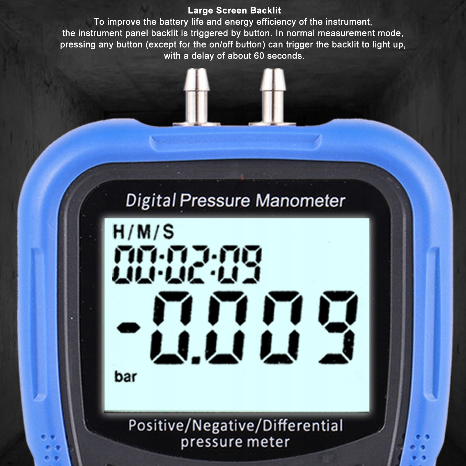 1. [Висока точність вимірювання] Завдяки діапазону вимірювання ± 30 psi (206,8 кПа) і точності ± 0,3% повної шкали цей цифровий манометр забезпечує точні показання.