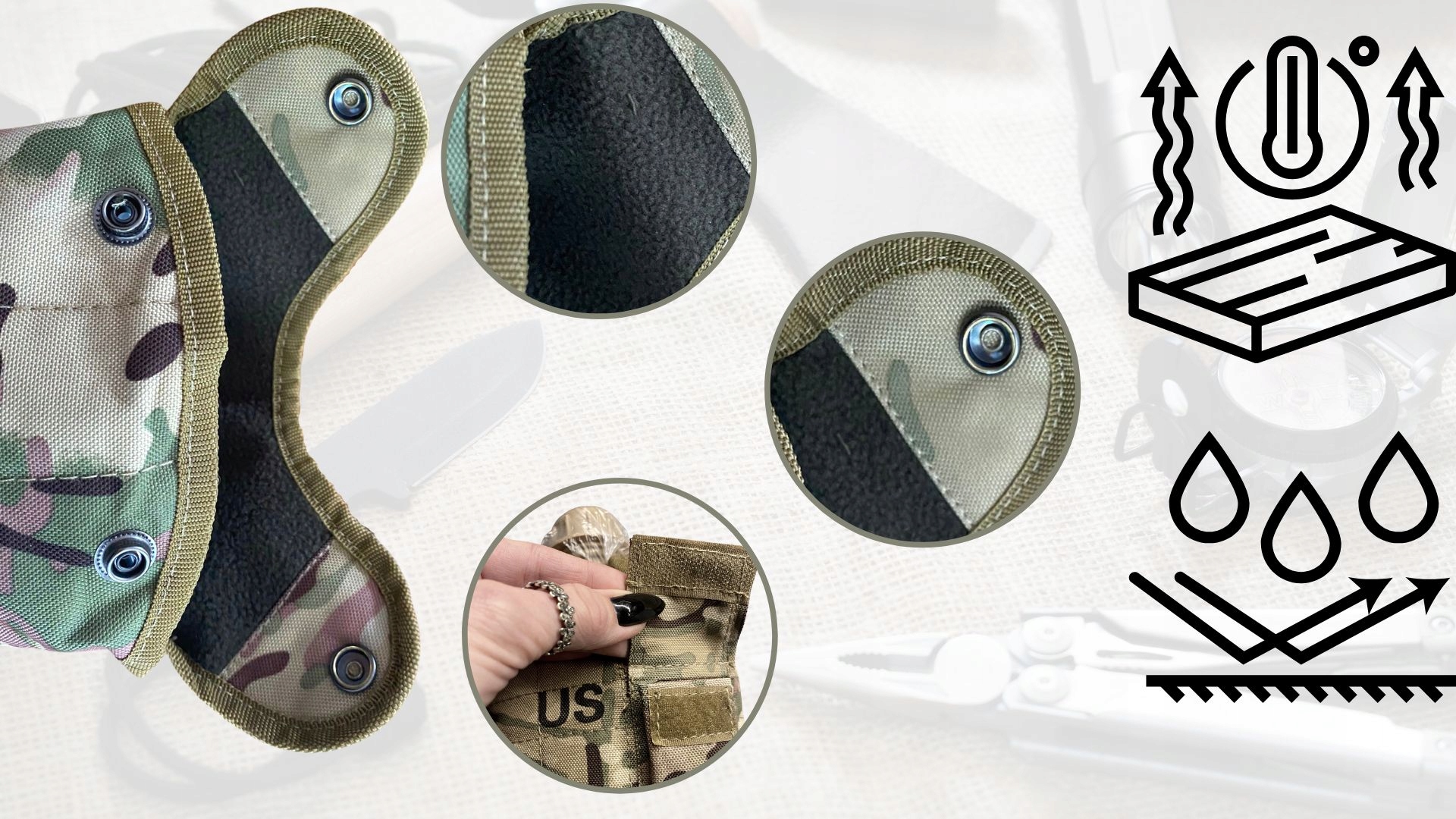 ✅Заклепка з шипами внизу - отвір для відведення води з внутрішньої сторони кишені в разі затоплення. Оснащений кишенею для планшетівдля очищення води або палива. Закривається на липучку, легко відкривається.