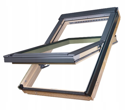 мансардним вікном FAKRO FTP-V U3 з деревини сосни, двічі пофарбоване екологічною натуральною акриловою фарбою. Вікно відкривається за допомогою ергономічної ручки Elegant.