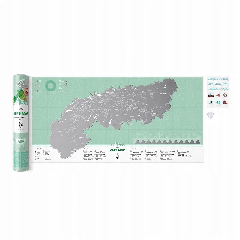 Скретч-карта Альп — це незвичайна карта гірського масиву Альп, захована під срібною скретч-карткою. Феномен скретч-карти заснований на видряпуванні місць або вершин, які вже були підкорені. Ви також можете нашкребти місце перед поїздкою, щоб побачити, що цікавого в цьому районі. Карта Альп показує найвищі точки Альп, найважливіші маршрути та їх протяжність, найважливіші пам’ятки ЮНЕСКО, найкращі гірськолижні курорти та природні чудеса. Крім того, у верхньому лівому куті є діаграма з відсотками площі Альп в окремих країнах. Унизу праворуч надруковано найважливіші вершини Альп, а також висоту та довжину маршруту та країну, у якій розташована вершина.