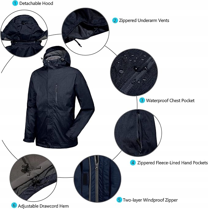 ❄ Softshell 3 в 1 Softshell: Чоловіча 3 -1 -1 на гірськолижній куртці пропонує універсальне використання, поєднання з водонепроникною пальто та всередині Softshell. Навесні та осінь зовнішнє покриття може бути вітряком. Внутрішня куртка Sofeshell забезпечує відмінне утримання тепла та підтримує тепло та комфорт під час глибокої осені. Антивіатральна куртка та внутрішня підкладка Softshell можна поєднувати, щоб повністю ущільнюватися, щоб запобігти холодному зиму. Знімний і регульований відбивний захист підборіддя, гнучкий Welt, безшовні блискавки та липучки захищають від вітру під час шторму. Усі блискавки мають водонепроникну структуру, водонепроникна тканина може запобігти потраплянню води та плям, завдяки якому ви можете легко боротися з погодою в свіжому повітрі в дощову погоду.