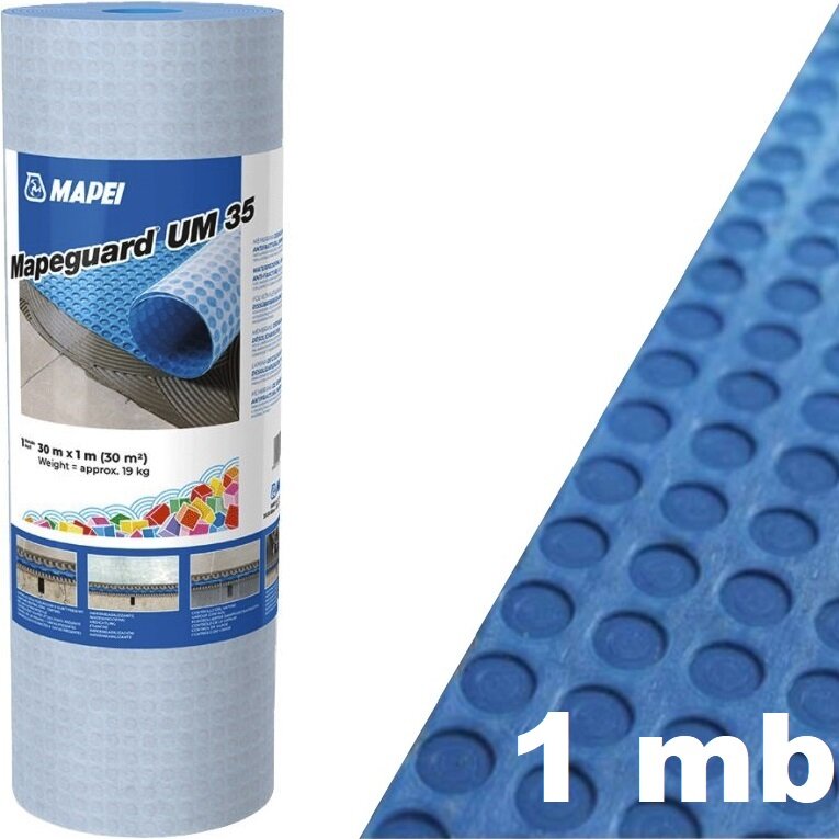 Mapeguard UM35 — це підплиткова ущільнювальна та роз’єднувальна мембрана, що запобігає утворенню тріщин, виготовлена з поліетилену високої щільності (HDPE) та поліпропіленового нетканого полотна спеціальної стільникової форми. Використовується перед монтажем керамічної та кам’яної облицювання всередині та зовні.