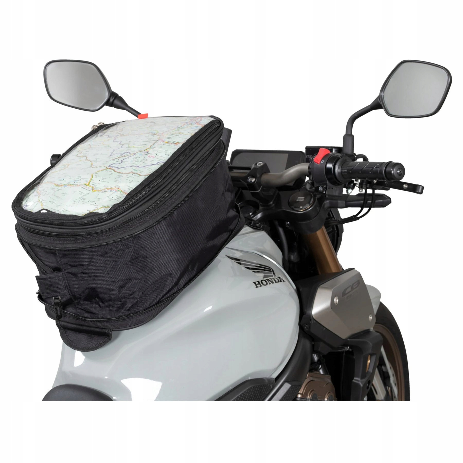 У той же час функція "вирівнювання" означає, що мішок для резервуара не адаптується до кривизни резервуара, а зберігає свою форму. У передній частині порівняння з картою на стороні водія є зберігання телефону, а також для ліхтарика, невеликих чи інших аксесуарів. Кришка жорстка. Знімний ремінь до керма забезпечує додаткову безпеку.