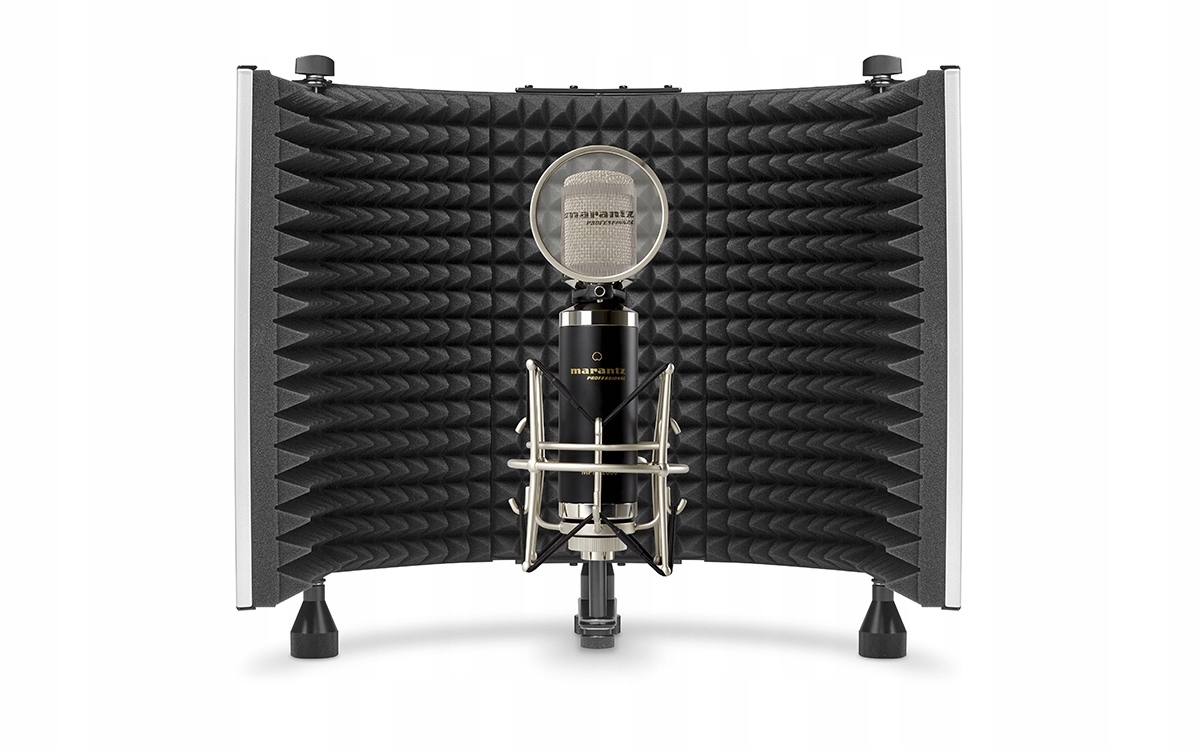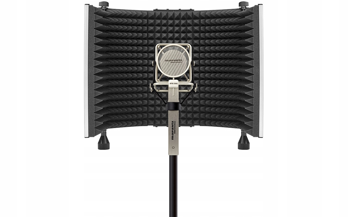 Переносна перегородка для запису, що зменшує навколишній шум, складається з п’яти високоякісних перфорованих листових панелей (3 стаціонарні, 2 складні). Його можна використовувати безпосередньо на столі або прикріпити до тримача мікрофона
