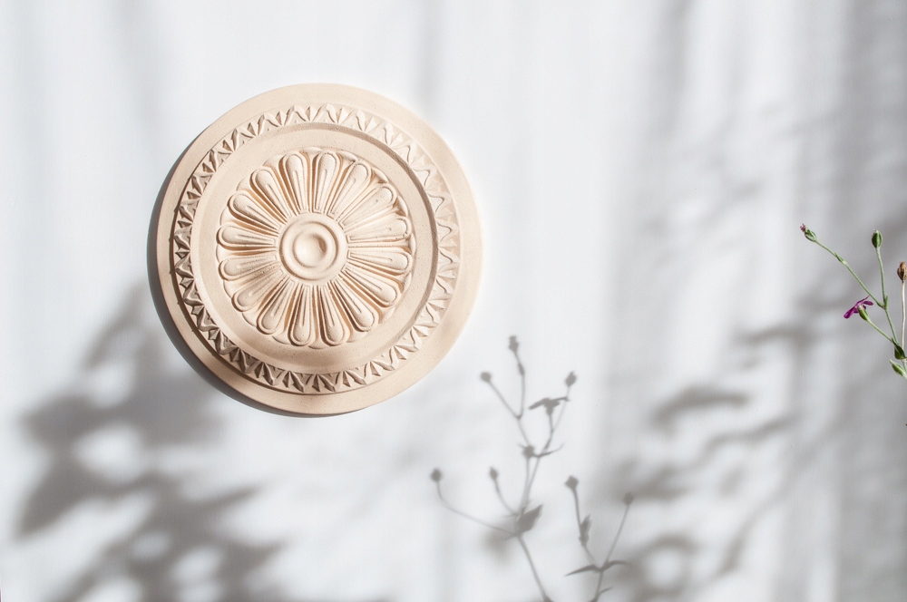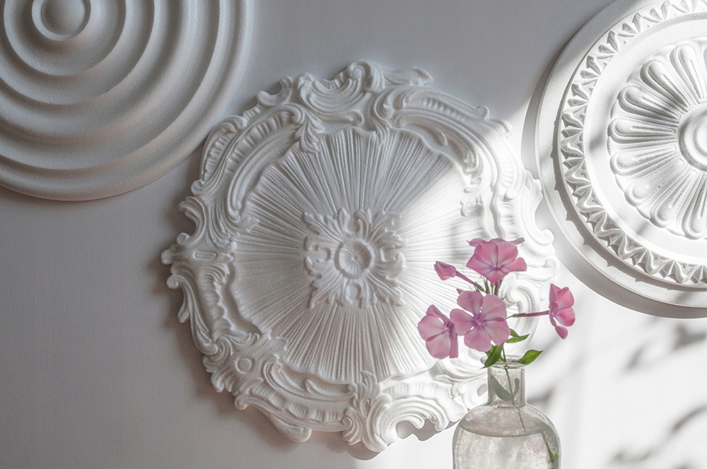 Розетки можна фарбувати водоемульсійними фарбами (латексними або акриловими), щоб ви могли підібрати колір обраної моделі до оформленого простору. Завдяки планкам, розеткам та іншим елементам ліпнини можна оригінально замаскувати її