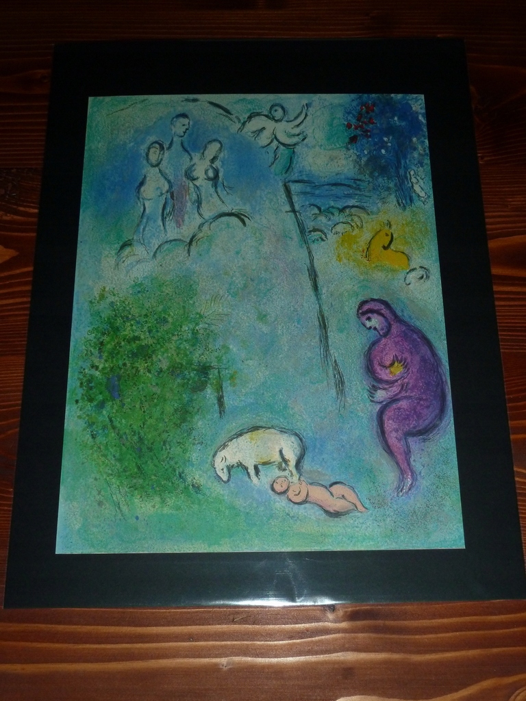 Я хочу запропонуватиілюстрацію Марка Шагала, опубліковану George Braziller New York для цінної серії «Дафніс і Хлоя»(літографії з серії були на аукціони таких цінних будинків аукціони типу Sotheby's - фото обкладинки аукціонного каталогу додається). Ілюстрація була опублікована за згодою автора в 1977 році (ще за життя художника). Видання на щільному папері, друга сторона аркуша порожня. Ілюстрація жодного разу не була в рамці, дуже хороший стан.