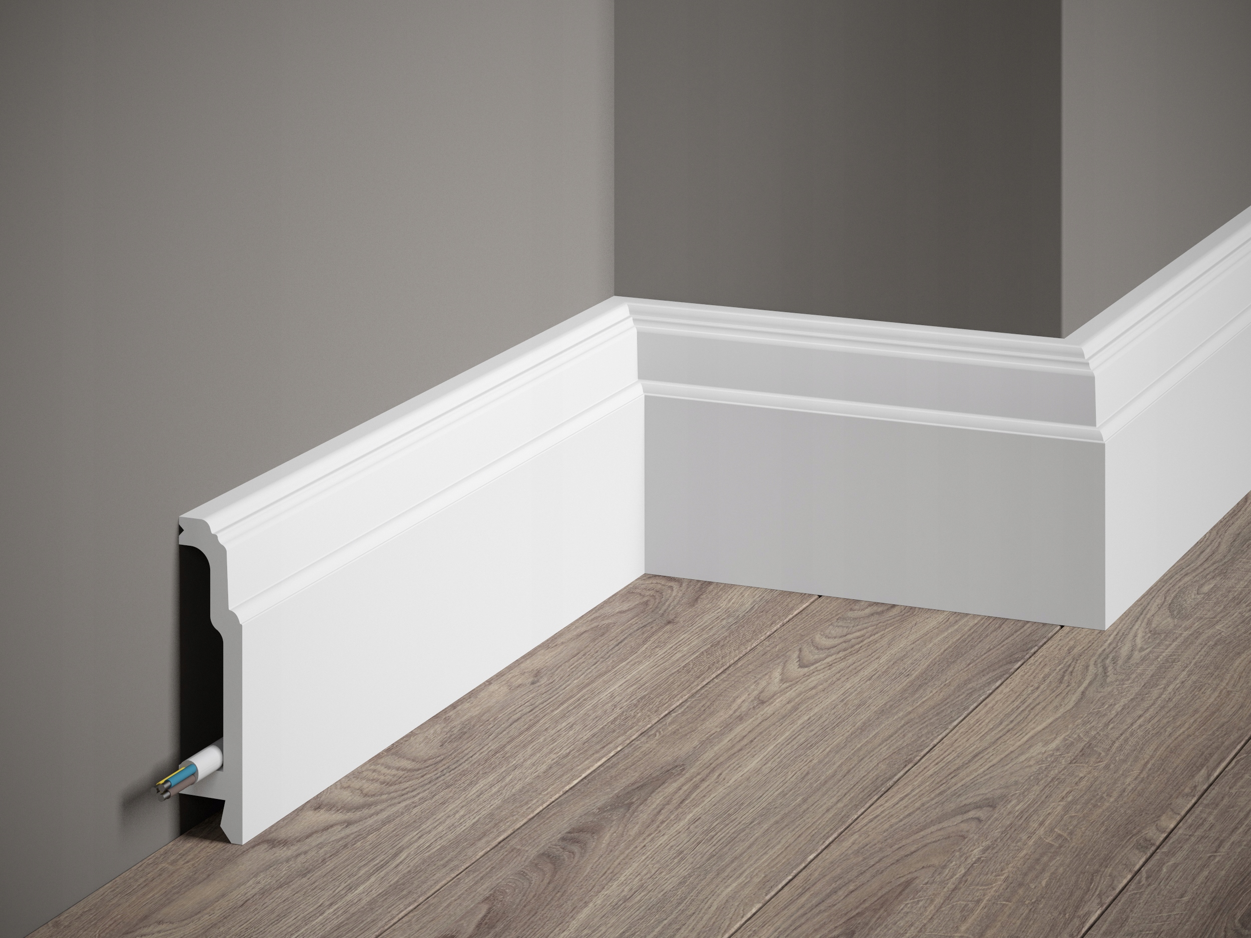 MD363 плінтусна плата - це оригінальний профіль, закінчений характерною прикрасою, яка буде відповідати сільським та сучасним інтер'єрам. Глибина 2,3 см дозволяє ефективно покривати широкі розширення. Відповідний проект врахував потребу користувачів щодо естетичного приховування домашніх каналів. У смузі є простір, призначений для цього.