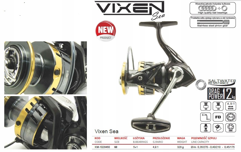 Vixen Sea, міцна котушка, оснащена п’ятьма шарикопідшипниками та одним підшипником проти реверсу. Регулювання гальм розташоване у верхній частині корпусу. Відрізняється невеликою вагою і хорошим балансом, має антивібраційну систему і алюмінієву ручку. У комплект входить одна алюмінієва шпуля. Підшипники та вал з нержавіючої сталі.