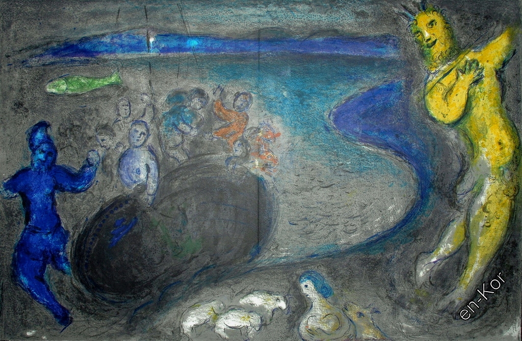 "У 1952 р. [Грецький видавець, спадкоємець А. Воллард] Теріаде замовив ілюстрації від Хагалла до стародавнього романсу" Дафніса та Хлої ". Це, мабуть, єдиний твір грецького ритора, граматики та вченого Лондоса, який написав його в другому столітті. Чесність це мала тривалий вплив на європейську літературу. їх любителі.