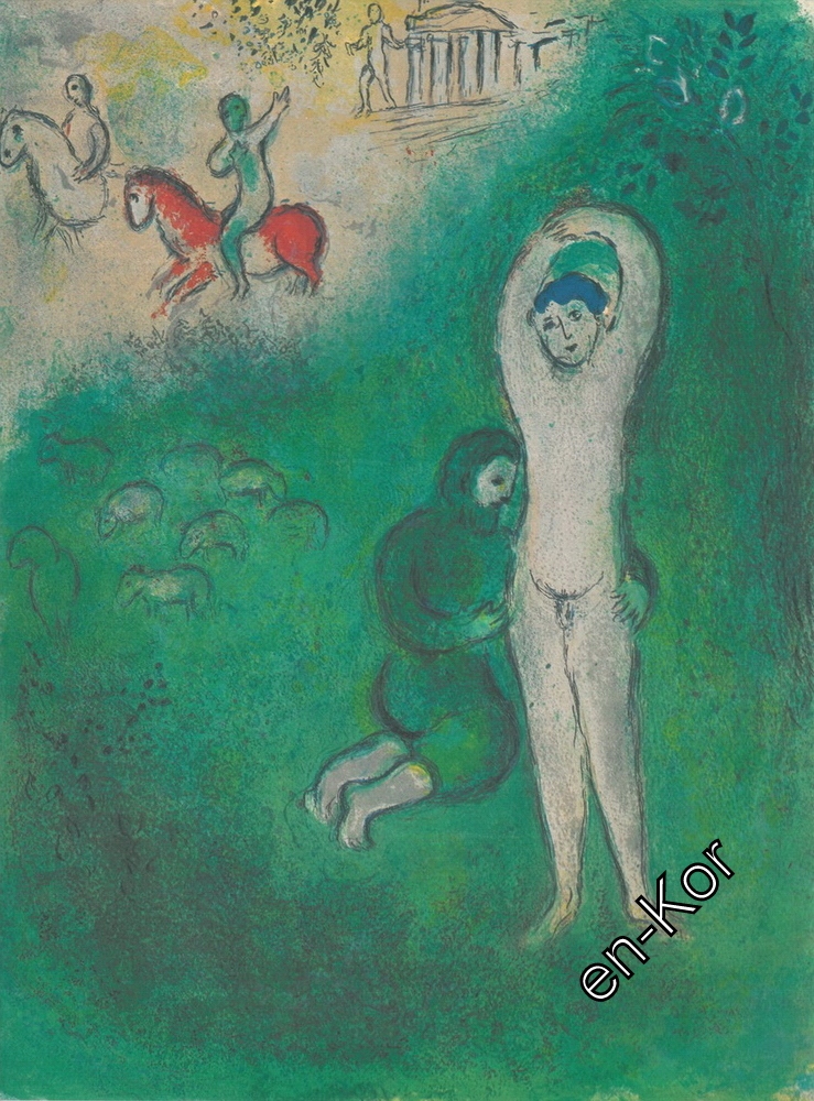 "У 1952 році [грецький видавець, спадкоємець А. Воллара] Теріаде доручив Шагалу проілюструвати старовинний роман "Дафніс і Хлоя". Це був, мабуть, єдиний твір грецького ритора, граматика та вченого Лонгоса, який написав його у ІІ столітті нашої ери. Ця повість, сповнена лірики Чарівність і чуттєва щирість, захоплювалися Шекспіром і Гете. Перший повний рукопис «Дафніса і Хлої» був знайдений лише в 1810 році у Флоренції Середземноморське королівство Пана та Еросу, вплетене в них мотиви з фольклору російських євреїв, зображено тут у характерному для Шагала витонченому стилі, що нагадує Едем