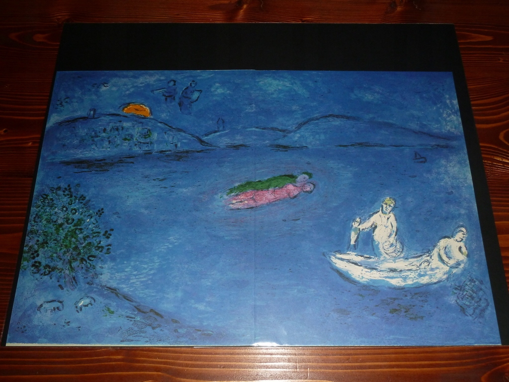 Я хочу запропонувати офсетну літографію Марка Шагала, опубліковану George Braziller New York для цінної серії «Дафніс і Хлоя» (літографії з цієї серії були виставлені на аукціон таких поважних аукціонних будинків, як, наприклад, Sotheby's - фотографія обкладинки аукціонного каталогу додається). Ілюстрація була опублікована за згодою автора в 1977 році (ще за життя художника). Видання на щільному папері, друга сторона аркуша порожня. Ілюстрація ніколи не була оформлена в раму, в хорошому стані - складка посередині після складання "навпіл".