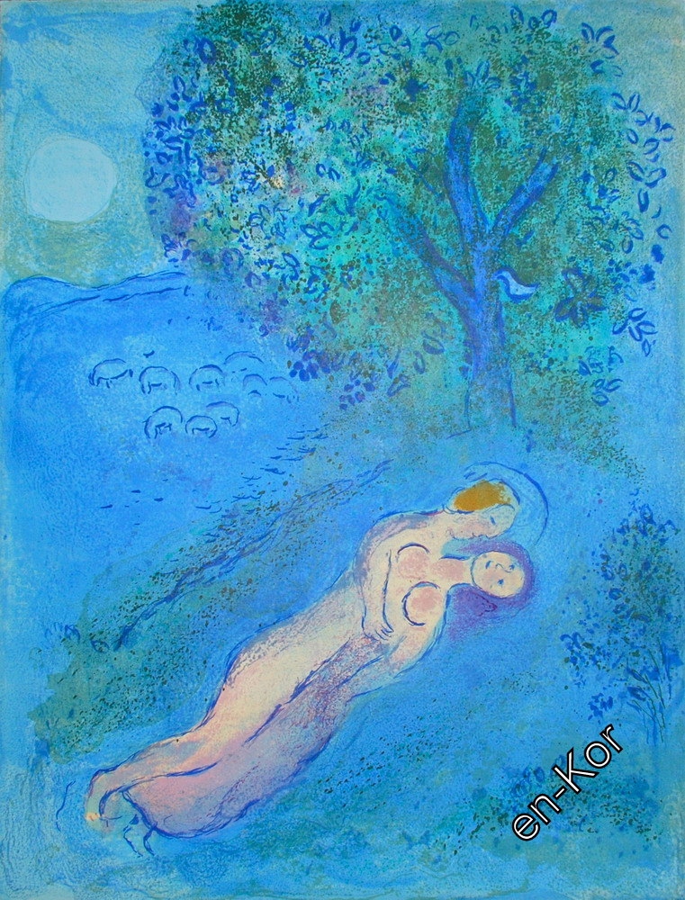 "У 1952 році [грецький видавець, спадкоємець А. Воллара] Теріаде доручив Шагалу проілюструвати старовинний роман "Дафніс і Хлоя". Це був, мабуть, єдиний твір грецького ритора, граматика та вченого Лонгоса, який написав його у ІІ столітті нашої ери. Ця повість, сповнена лірики Чарівність і чуттєва щирість, захоплювалися Шекспіром і Гете. Перший повний рукопис «Дафніса і Хлої» був знайдений лише в 1810 році у Флоренції Середземноморське королівство Пана та Еросу, вплетене в них мотиви з фольклору російських євреїв, зображено тут у характерному для Шагала витонченому стилі, що нагадує Едем