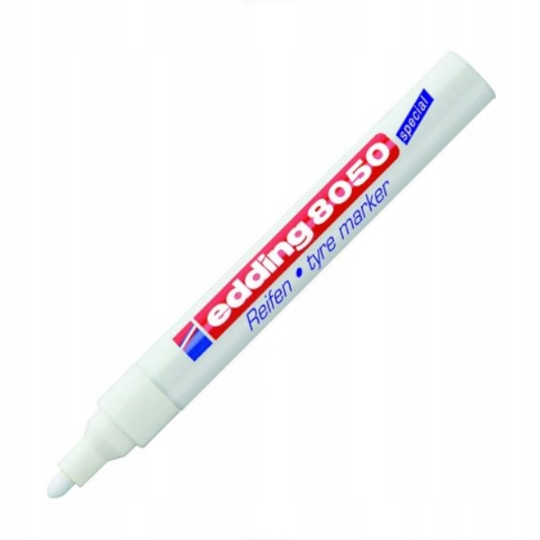 Стійка біла фарба, яка швидко висихає, добре помітна темні шини. Крім того, він надзвичайно стійкий до стирання та ударів легкий, що робить шинний маркер edding 8050 важливим інструментом у ваших руках будь-хто, хто працює з шинами або матеріалами з гуми, наприклад, механіки автовласники або автовласники, які самостійно доглядають за своїми автомобілями автомобіль.