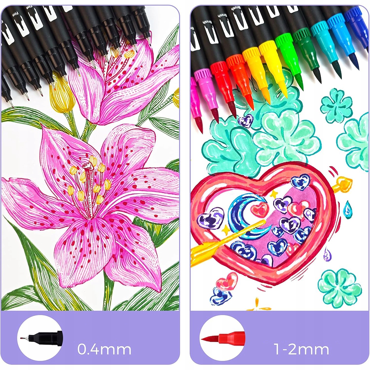 🎨Товсті та тонкі маркери. Файнлайнер товщиною 0,4 мм підходить для малювання відносно тонких ліній. Ви можете використовувати його для нотаток і структурованих малюнків. Фломастери товщиною 1-2 мм ідеально підходять для розмальовування книжок, підписів на документах, дизайну, мистецьких проектів і ручного напису.