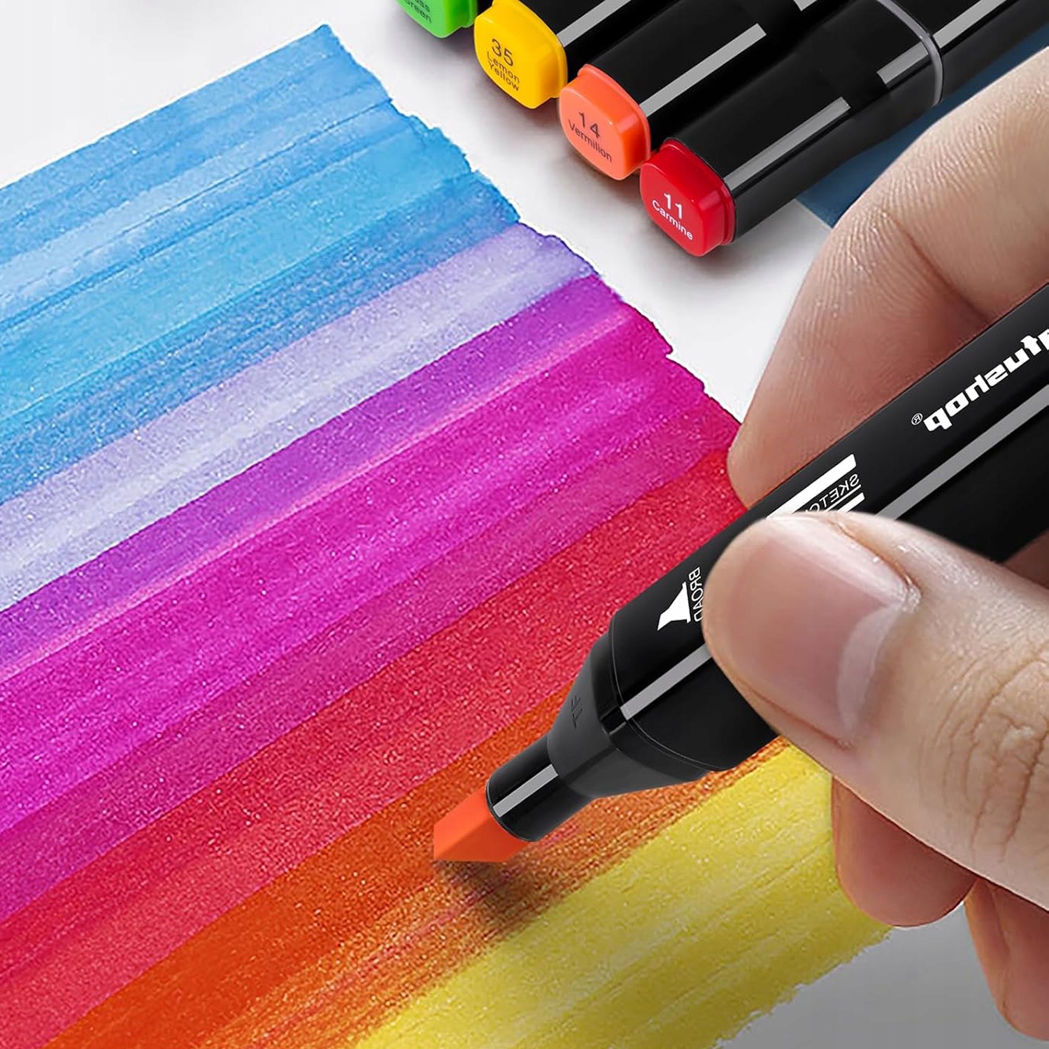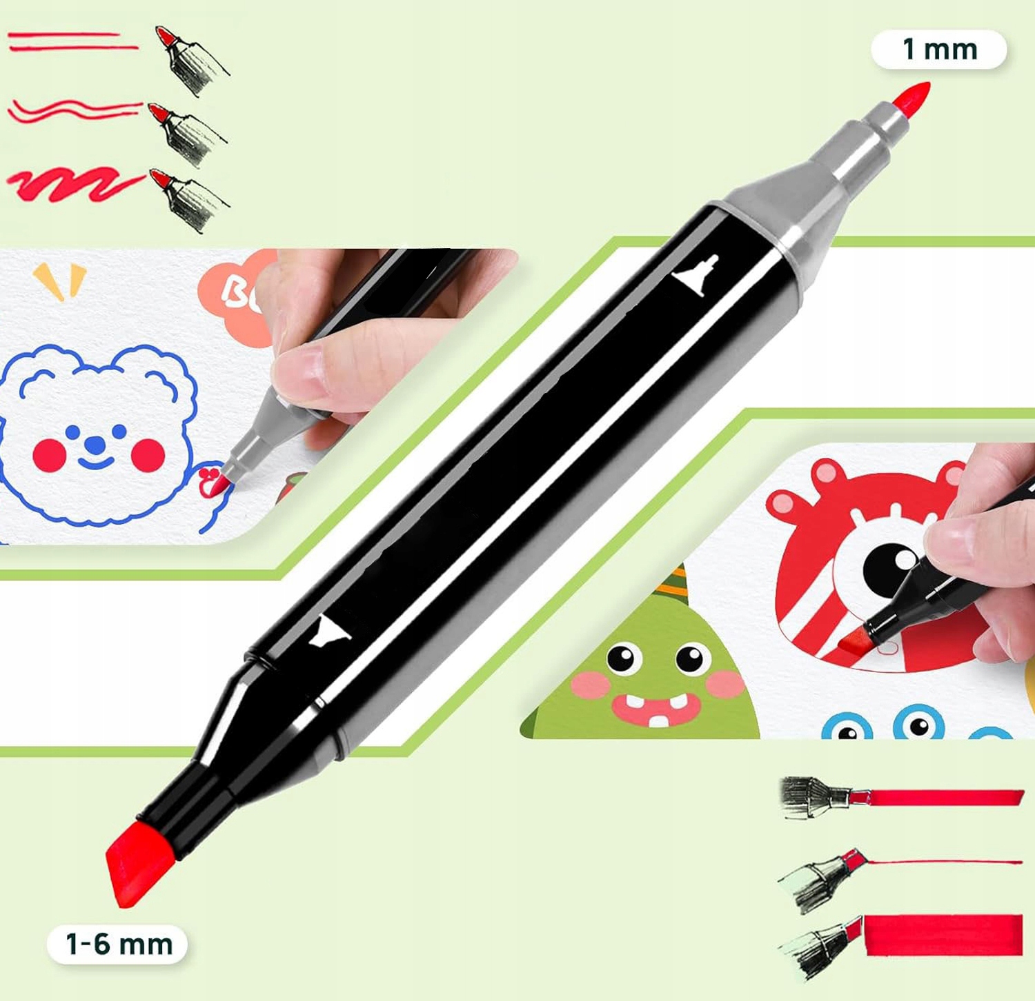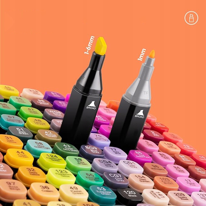 🖌️ 【DOUBLE-SIDED PRECISION】 – двосторонній маркер із тонким кінчиком (1 мм) для точних ліній і широким кінчиком (6 мм) для фарбування великих поверхонь. Ідеально підходить для ескізів, затінення та заливки — воно задовольнить усі ваші потреби в малюванні!