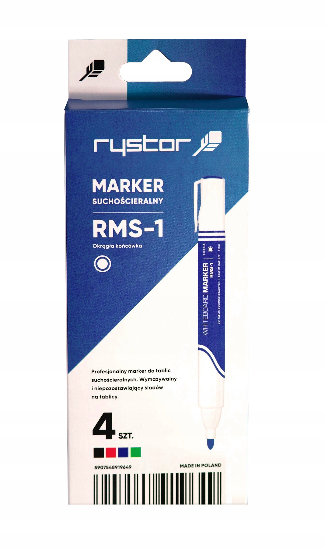 Фломастери RYSTOR RMS-1 з високоякісним чорнилом насичений колір призначений для письма на сухостираних дошках. Вони підходять також підходить для написання на папері, дереві, пластику, металі та склі. Є швидко висихає і легко видаляється з поверхні дошки сухе стирання.