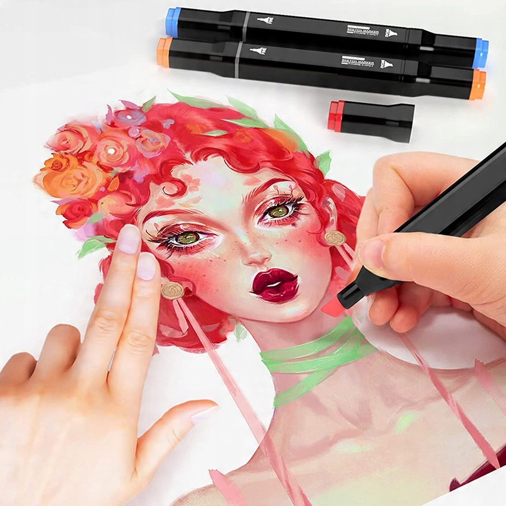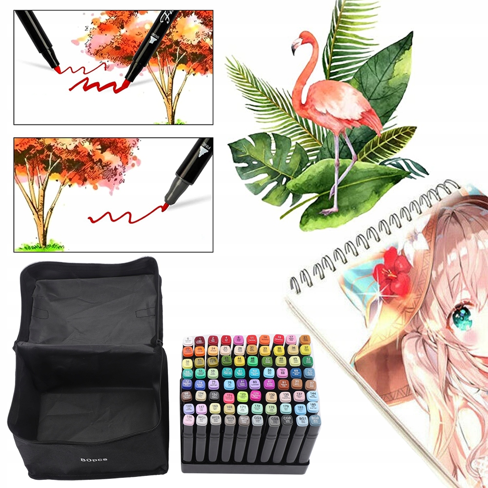 - двосторонні маркери: кілька 80 двосторонніх маркерів, тонких з одного боку та товстих з іншого . Обидві сторони мають накладки та забарвлюються під час малювання. Вони містять різні кольори, щоб маркери не висихали занадто швидко.