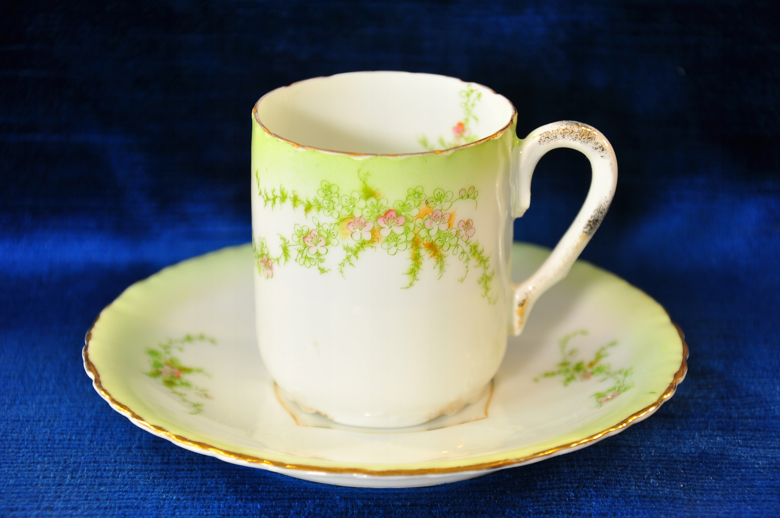 Предметом аукціону є чашка в стилі модерн від фабрики Jaeger у м. Маркредтвіц . Дуже хороший стан, красивий зелений розпис, квіти, майже не пошкоджена позолотата. Подивіться на фотографії та вкажіть фактичний стан. Ви купуєте порцеляну, зображену на фотографіях.