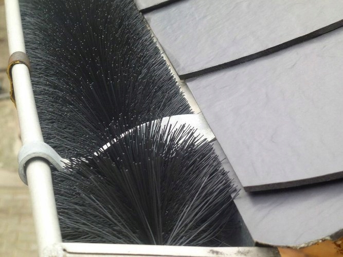 Щітка виготовлена зі спеціального матеріалу, стійкого до ультрафіолетового випромінювання b>. Спеціальне плетіння щетини утворює голки, як у їжака, захищаючи доступ куниць та інших дрібних тварин до конструкції даху. Стримує птахів від сидіння в канаві, відсутність екскрементів у канаві. жолоб.