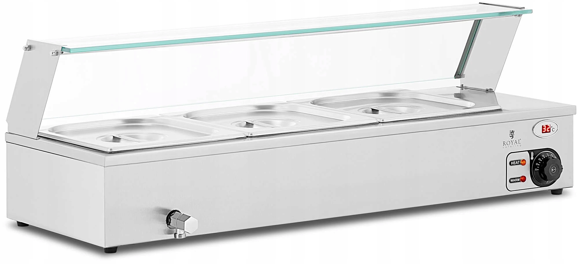 Ефективний нагрівальний елемент потужністю 2000 Вт швидко нагріває воду до потрібної температури. Ви можете ввімкнути автоматичний термостат за допомогою ручки, яка дозволяє точно регулювати температуру в діапазоні 30-110°C. Кришка із загартованого скла захищає продукти від забруднення. Це допомагає підтримувати температуру і водночас забезпечує чудову презентацію. Зливний кран полегшує наповнення, спорожнення та очищення обладнання.