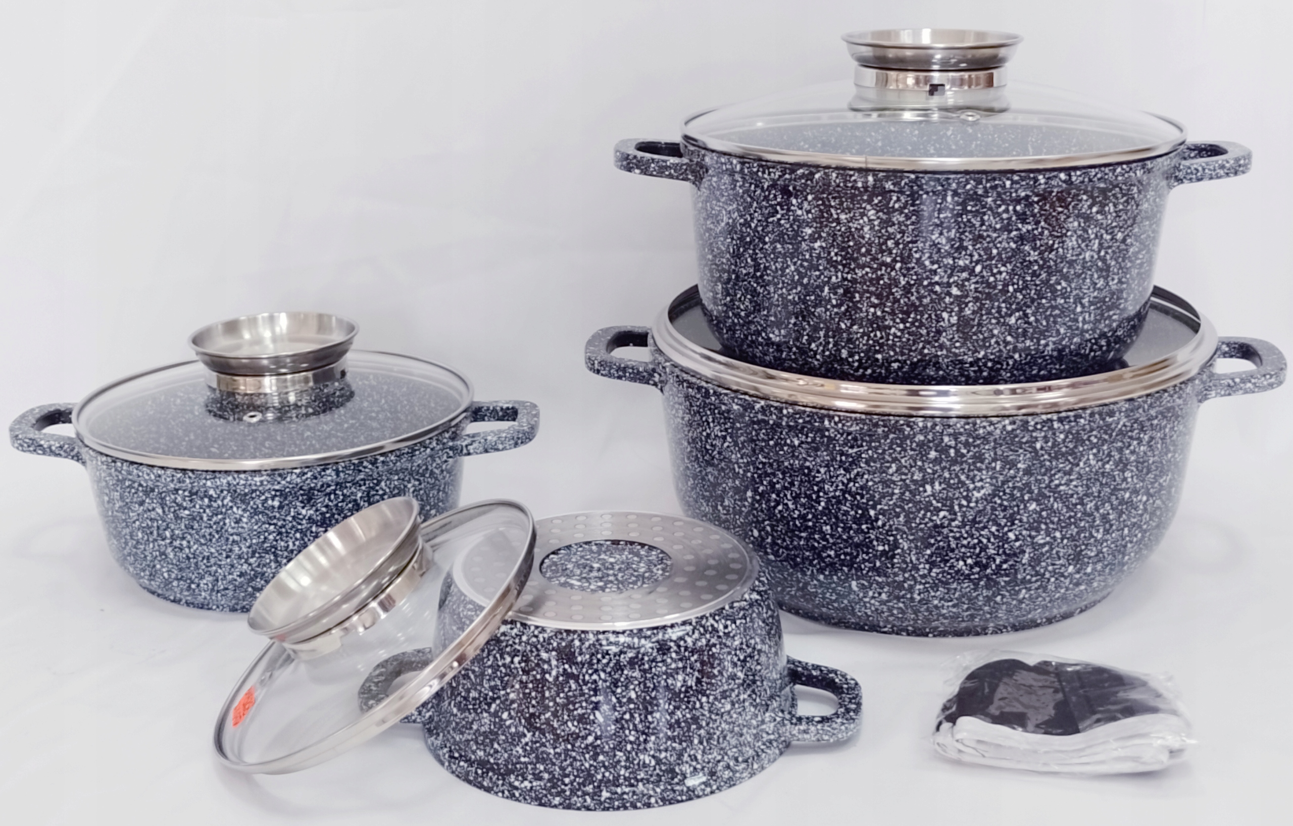 Каструлі з 8 частин із литого алюмінієвого сплаву з антипригарним мармуровим покриттям.