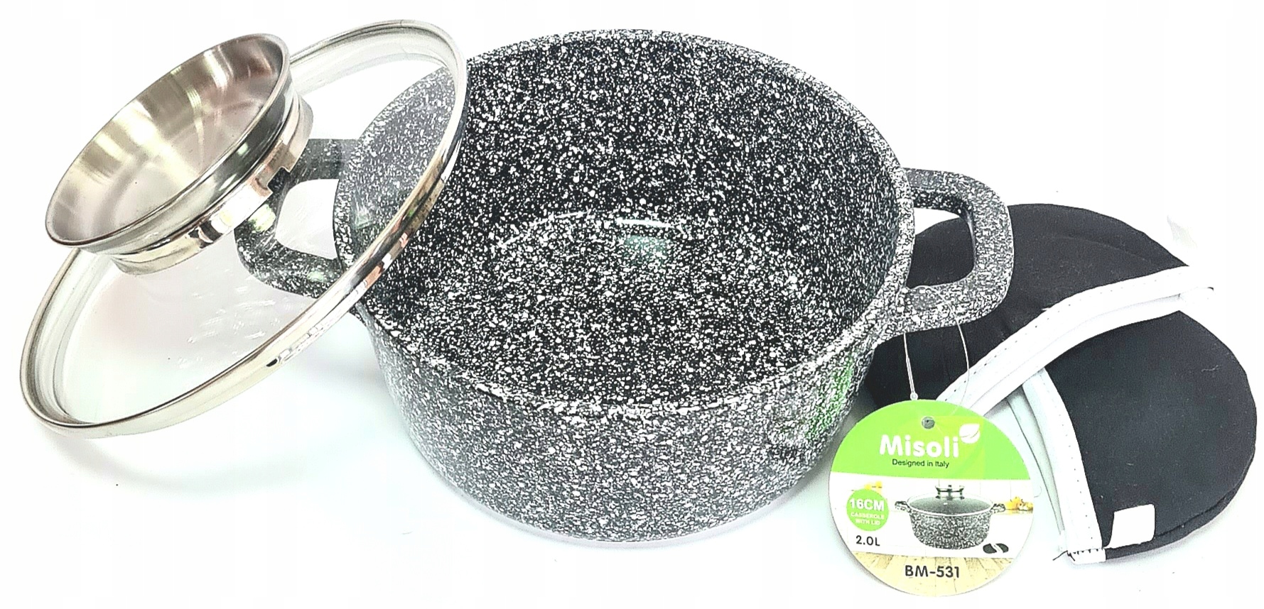 Високоякісна мармурова каструля 16 см / 1,3 л зі скляною кришкою. Виготовлена з литого алюмінію з мармуровим керамічним антипригарним покриттям. Виріб із міцним антипригарним мармуровим покриттям забезпечує здорове готування без жиру та легке миття та, перш за все, захищає їжу від пригорання. Використаний матеріал відмінно зберігає і проводить тепло.