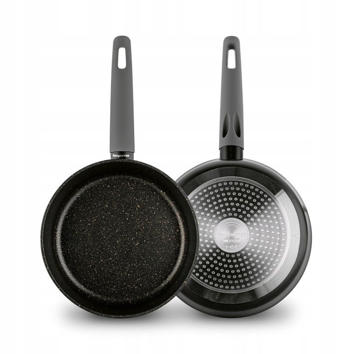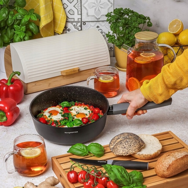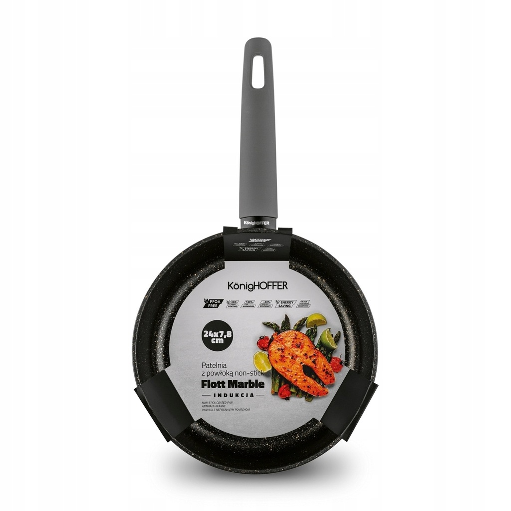 Глибока індукційна сковорода Konighoffer Flott Marble 24 х 7,8 см виготовлена з алюмінію і захищає їжу від прилипання. Він дуже міцний, ідеально збалансований і добре проводить тепло. Його викували в кованій техніці. У поєднанні з ручкою soft touch це забезпечить вам високий рівень комфорту використання. Його ручка не нагрівається і не ковзає навіть при мокрій руці. Виріб працює на будь-якому типі плити, оскільки має індукційне дно. Це робить приготування їжі швидшим і економнішим. Довговічність жарильної поверхні сковороди з високим бортиком Flott заснована на тришаровому антипригарному покритті MARBLE PLUS (додатково посилене!). Він не містить шкідливих речовин (наприклад, PFOA), твердий і витримує до 10 000 циклів стирання (у 5 разів довше, ніж класичні сковорідки з антипригарним покриттям). Колекція каменю Konighoffer Flott Marble натхненна чистою красою природи і рекомендована для тривалого використання на домашній кухні. Ви можете легко підтримувати його в чистоті (без скрабування!) і змішувати всі інгредієнти.