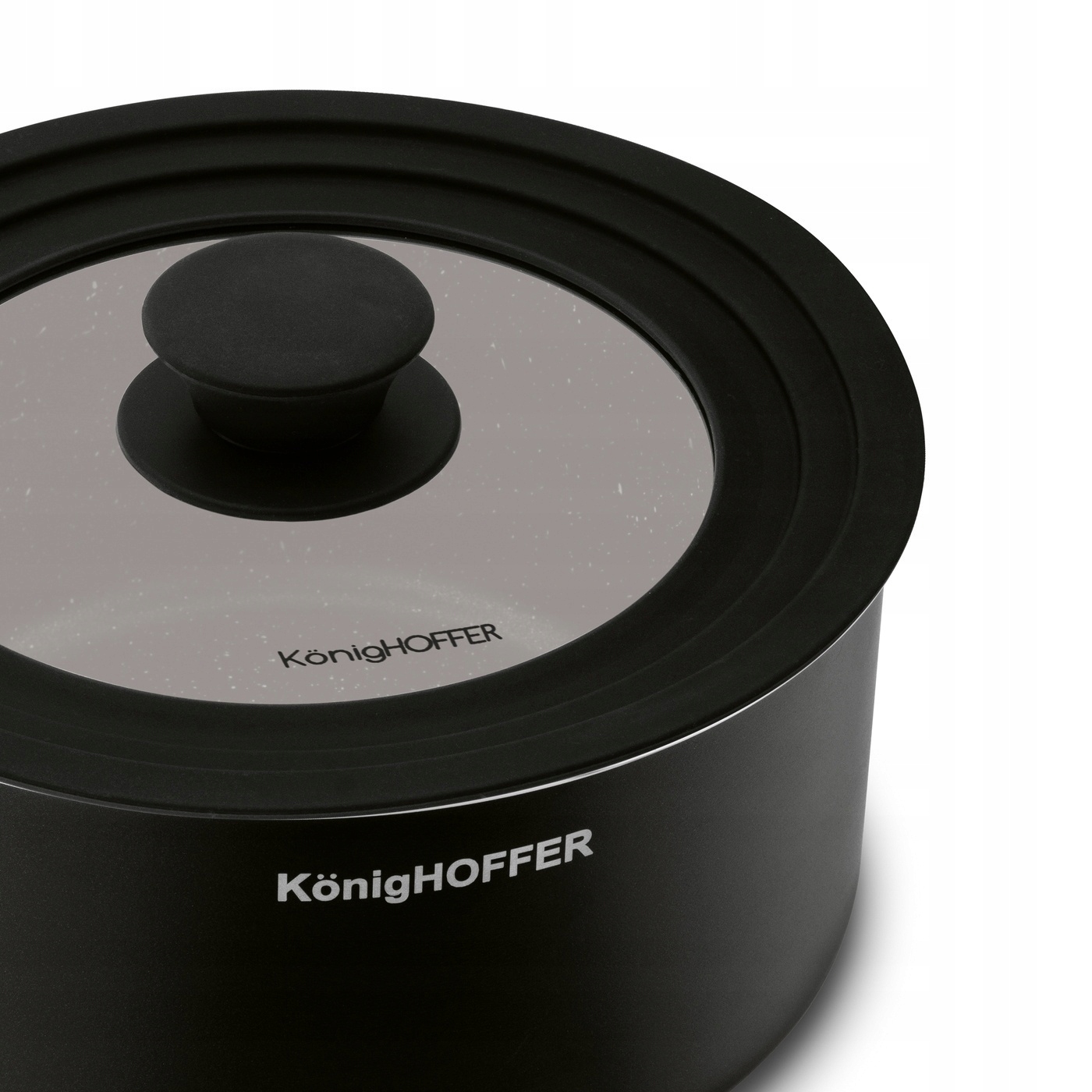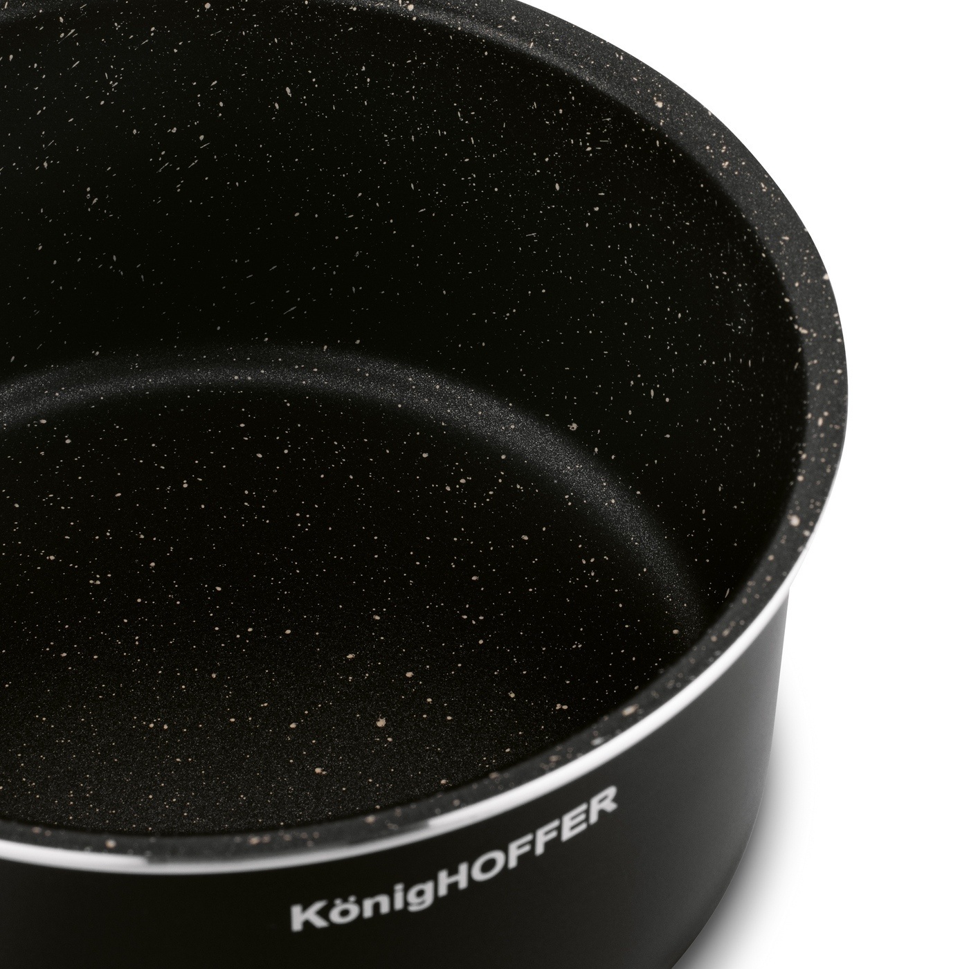 Набір каструль і сковорідок Konighoffer Spinel Black з антипригарним покриттям з кам'яним покриттям, 9 елементів, виготовлений з алюмінію. Це робить його енергозберігаючим і зручним. Підвищена довговічність забезпечується покриттям MARBLE PLUS, яке зменшує прилипання їжі. Його висока якість, твердість і структура були розроблені з урахуванням тривалого смаження та варіння (наприклад, пудингу). Енергоефективність забезпечується спеціальною конструкцією дна. Завдяки цьому ви можете використовувати каструлі та сковорідки зі шпінелі на індукційних, газових, електричних та керамічних плитах. Антипригарне покриття також дозволяє смажити з невеликою кількістю жиру та легким доглядом. Він також може витримувати до 10 000 циклів стирання (у 5 разів більше, ніж звичайний антипригарний мармуровий посуд, доступний на ринку). Перенесення і використання набору забезпечують дві ручки, які повільно нагріваються і надійно лягають в руку. Вони універсальні і знімні, тому підходять для каструль і сковорідок будь-якого діаметру з мармуровим покриттям Stone Spinel. З їх допомогою ви набагато простіше розмістите посуд у кухонній шафі чи ящику. З цим набором ви легко зможете створити власний набір кухонного посуду для домашнього використання та для всієї родини. Також є одна універсальна кришка з силіконовим обідком, яка підходить для всіх 3 каструль. Це один із найкращих варіантів у цій категорії!