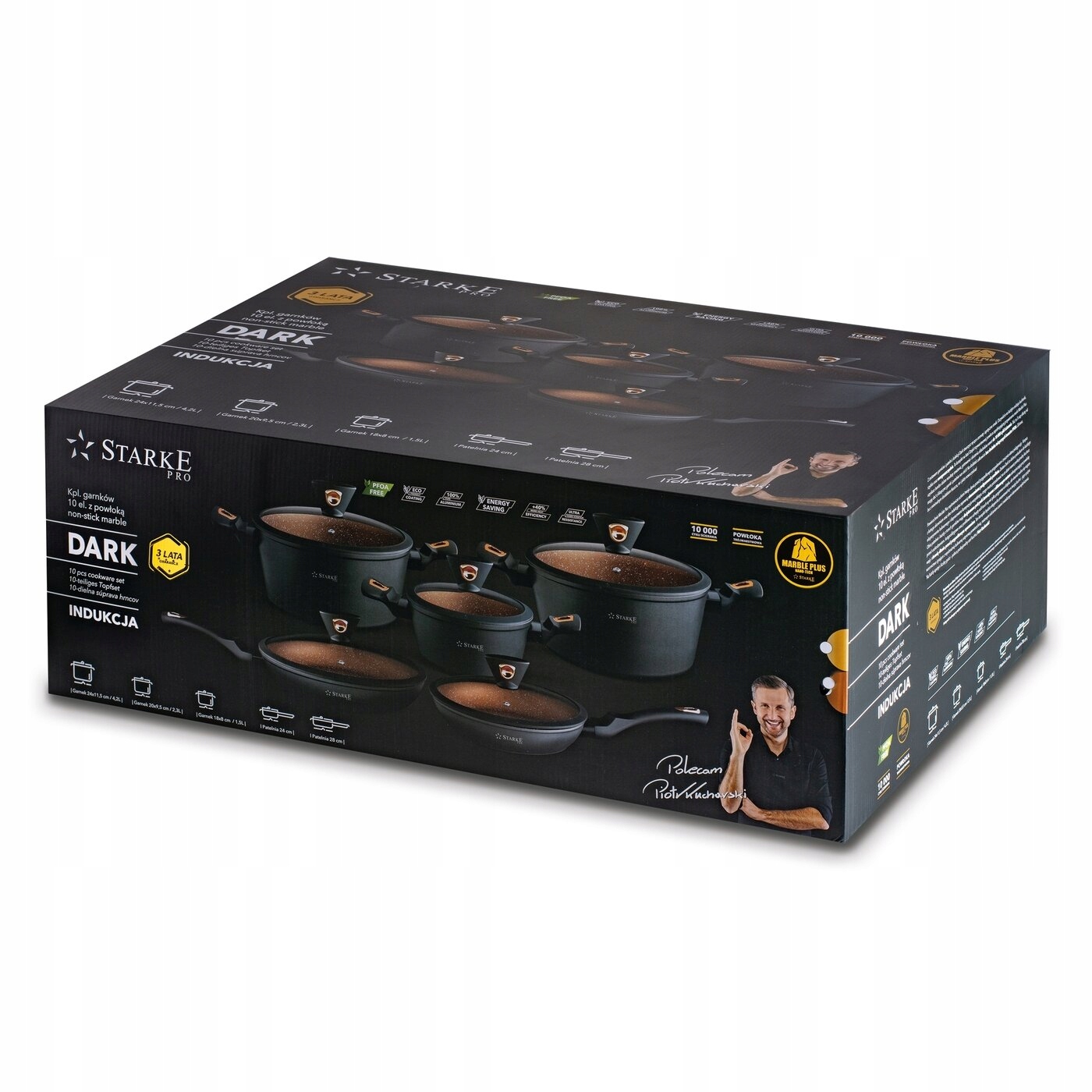 Набір антипригарних індукційних каструль Starke Pro Dark Copper із 10 предметів із кришками виготовлений з алюмінію, має товсті стінки та захищає їжу від прилипання. Тип кузовів, які він використовує, — це гаряче ковані з одного аркуша металу за допомогою кованої техніки. Завдяки цьому 3 каструлі і 2 сковорідки - 24 і 28 см - дуже міцні і добре проводять тепло. Вони також ідеально збалансовані, що в поєднанні з не нагріваються і нековзкими ручками soft touch забезпечить вам високий рівень комфорту використання. Набір працює на будь-якому типі плити, оскільки використовує індукційне дно товщиною 3,2 мм. Це робить приготування їжі швидшим і економнішим. Довговічність внутрішньої поверхні посуду колекції Dark заснована на тришаровому антипригарному мармуровому покритті MARBLE PLUS (товщина 35-43 мікрометра). Він не містить шкідливих речовин (наприклад, PFOA), твердий, має чудову адгезію та природну текстуру та витримує до 10 000 циклів стирання. Це також полегшує догляд (не можна мити в посудомийній машині, можна мити лише вручну). У набір також входить 5 спеціальних скляних кришок із силіконовими краями. Завдяки їм можна тушкувати їжу і зручно регулювати кількість пари всередині каструль або сковорідок. Серію Starke Pro Dark Copper з кам’яно-гранітним покриттям також тестував професійний шеф-кухар Пьотр Кухарскі. Він рекомендує його для тривалого використання на домашній кухні.